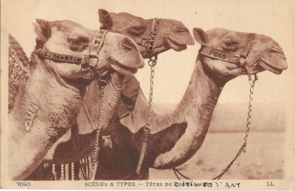 Albert Marquet qui appel ses « trois fils », L. L. Martin, Georges Charensol et Florent Fels, critiques d’art, à le rejoindre à Tunis, lieu de prédilection pour sa peinture. Avec malice, il s’est amusé à nommer les trois dromadaires représentés sur la carte postale du nom des trois critiques d’art et a modifié l’intitulé de la carte par : « Scènes & types – têtes de critiques d’Art » : « Chers fils, Nous partons pour Tunis. Faites vos préparatifs de départ et venez nous retrouver. Il fait un temps merveilleux trop beau pour travailler. Envoyez poste restante à Tunis.. »
