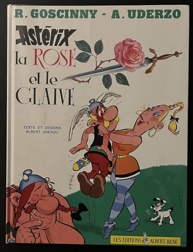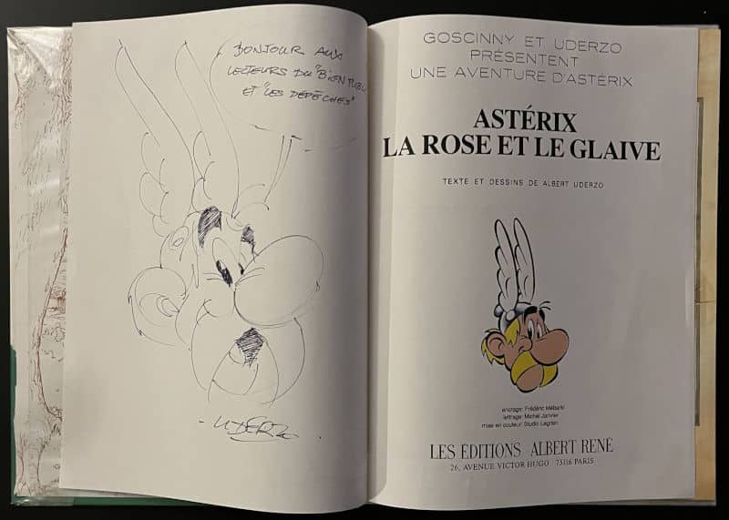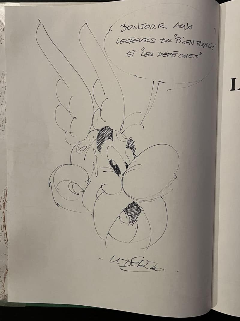 Astérix, dessin original réalisé au feutre fin dédicacé et signé en page de garde : « Bonjour aux lecteurs du « Bien Public » et « Les dépêches » », édition originale aux éditions Albert René.