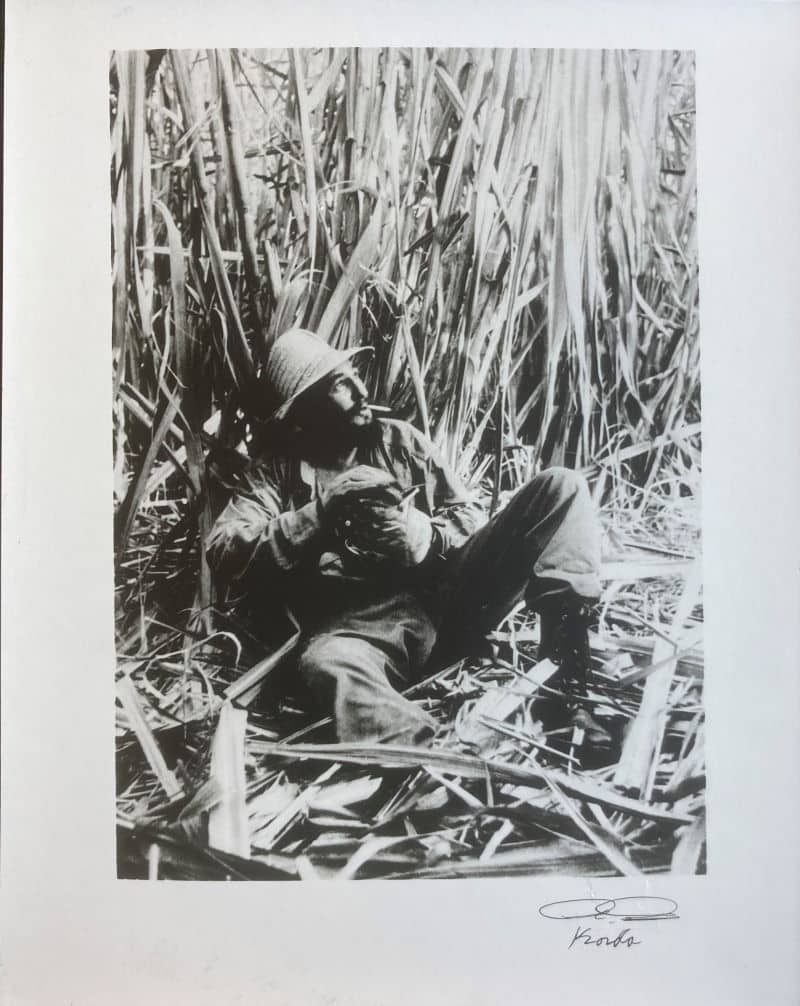 Rare et beau portrait de Fidel Castro s’accordant une pause cigarette au beau milieu d’un champ de cannes à sucre. Photo des premières années de pouvoir du jeune révolutionnaire, apportant son aide à la récolte des cannes à sucre. Photo prise par le célèbre photographe cubain Alberto Korda, photographe attitré de Castro, qui immortalisa le Che Guevara le 5 mars 1960, portrait qui fit le tour du monde « Guerillero Heroico ».