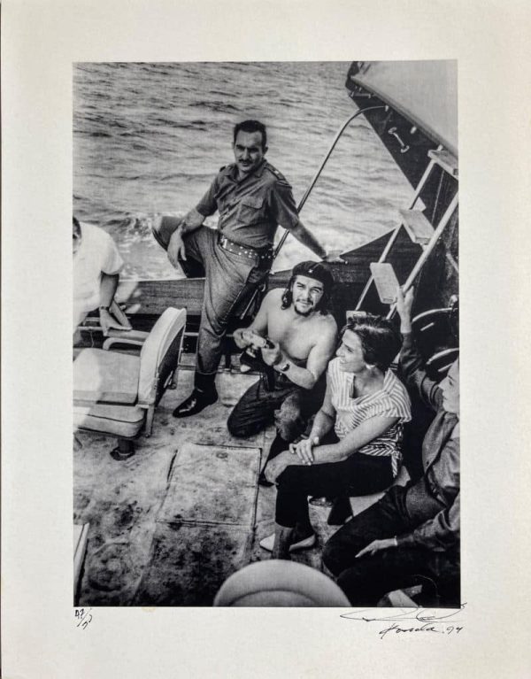 Partie de pêche dans les eaux cubaines à l’occasion du trophée Hemingway. Photo prise le 15 mai 1960 par le célèbre photographe cubain Alberto Korda qui immortalisa le Che le 5 mars 1960, par un portrait qui fit le tour du monde « Guerrillero Heroico ». Sur le cliché on reconnait le Che Guevara, grand passionné de photographie, avec un appareil photo dans les mains, et au premier plan Celia Guevara, sa mère, qui était venue lui rendre visite à Cuba. Elle ne le reverra pas, elle meurt en 1965 alors que le Che se trouve au Congo belge.