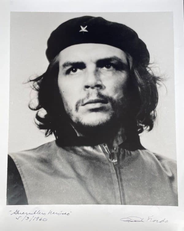 Célèbre photographie du Che Guevara immortalisé le 5 mars 1960 par le photographe cubain Alberto Korda, ce portrait charismatique du Che au regard noir et frondeur fit le tour du monde et traversa le temps. Korda nous raconte qu’une manifestation avait été organisée par Fidel Castro en hommage aux victimes du sabotage du navire français La Coubre qui mouillait en eau cubaine. Une estrade avait été montée, c’est alors qu’apparu le Che Guevara en arrière-plan de Fidel Castro qui était en compagnie de Simone de Beauvoir et de Jean-Paul Sartre. Son regard noir et intense fut saisi sur le vif par le photographe. Mais cette photo ne fut pas retenue par le journal révolutionnaire « Revolución » qui ne la publia qu’en février 1961. Sa notoriété fut acquise après la mort du révolutionnaire, le 9 octobre 1967, quand l’éditeur italien Giangiacomo Feltrinelli, qui avait acheté l’été d’avant un ensemble de photos du Che Guevara auprès de Korda, imprima le portrait sur plusieurs affiches qu’il vendit à des milliers d’exemplaires. La légende était en marche.
