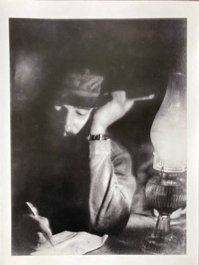 Rare et beau portrait de Fidel Castro un cigare pour seule compagnie, au soir, rédigeant un courrier éclairé par une lampe à pétrole . Photo prise durant la révolution cubaine de 1958 par le célèbre photographe cubain Alberto Korda, photographe attitré de Castro, qui immortalisa le Che Guevara le 5 mars 1960, portrait qui fit le tour du monde « Guerillero Heroico ».