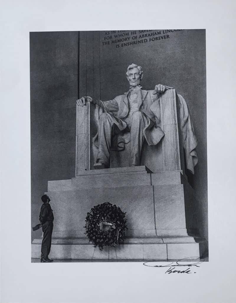Une des plus célèbres photos de Fidel Castro lors de son premier séjour officiel aux Etats-Unis du 16 au 26 avril 1959. Cette photo fut prise le matin du 19 avril au Monument Lincoln de Washington. Fidel Castro y déposa une couronne de fleurs en signe de respect du tout jeune gouvernement révolutionnaire cubain envers le grand frère américain. Photo prise par Alberto Korda, photographe attitré de Fidel Castro, mondialement connu pour avoir immortalisé le Che Guevara le 5 mars 1960, portrait qui fit le tour du monde « Guerillero Heroico ».