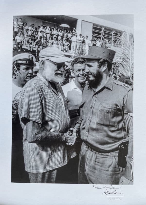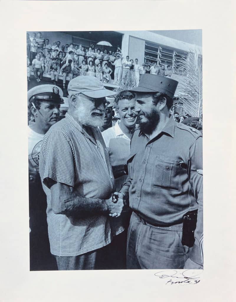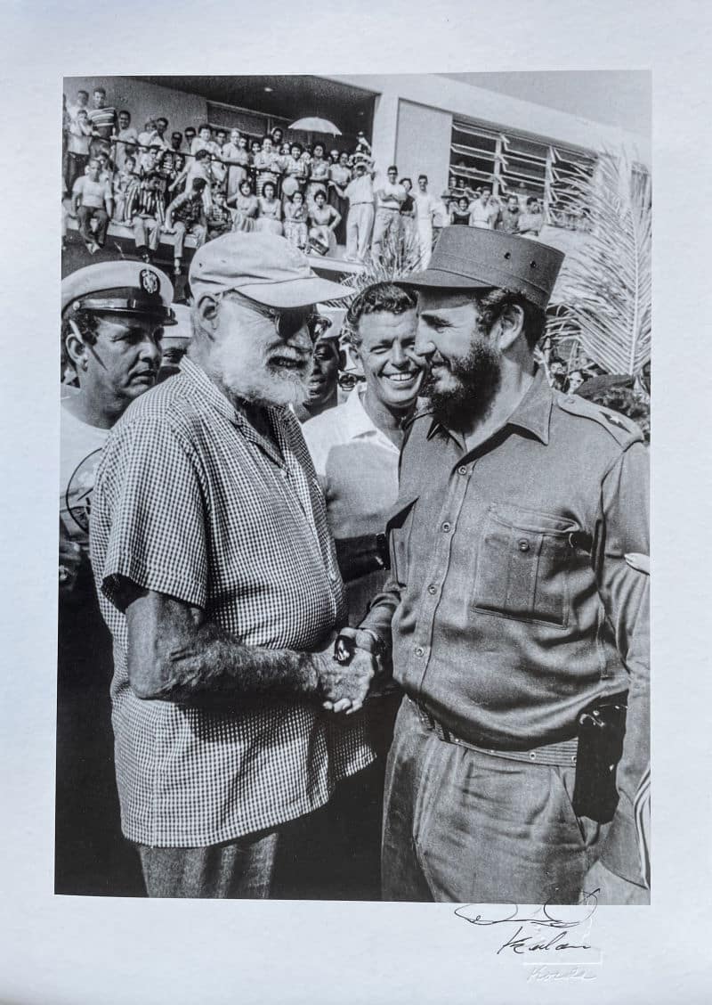 Célèbre cliché de la poignée de main entre Hemingway et Castro lors de la remise du trophée de pêche Hemingway le 15 mai 1960. Photo prise par Alberto Korda, photographe attitré de Fidel Castro, mondialement connu pour avoir immortalisé le Che Guevara le 5 mars 1960, portrait qui fit le tour du monde « Guerillero Heroico ». Le jeune Fidel Castro, qui venait de prendre le pouvoir à Cuba en janvier 1959, remporta la compétition. La remise du trophée par Hemingway fut la seule et unique fois où les deux hommes se rencontrèrent.