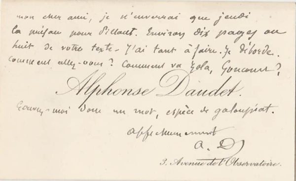 Jolie carte d’Alphonse Daudet qui s’inquiète de la santé de ses amis Emile Zola et Edmond de Goncourt : « Je n’enverrai que jeudi la préface pour Sillant. Environ dix pages ou huit de votre texte. J’ai tant à faire. Je déborde. Comment allez-vous ? Comment va Zola, Goncourt ? Ecrivez-moi donc un mot, espèce de galoupiat »