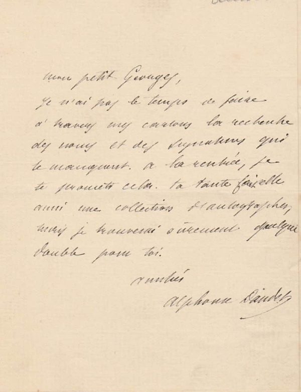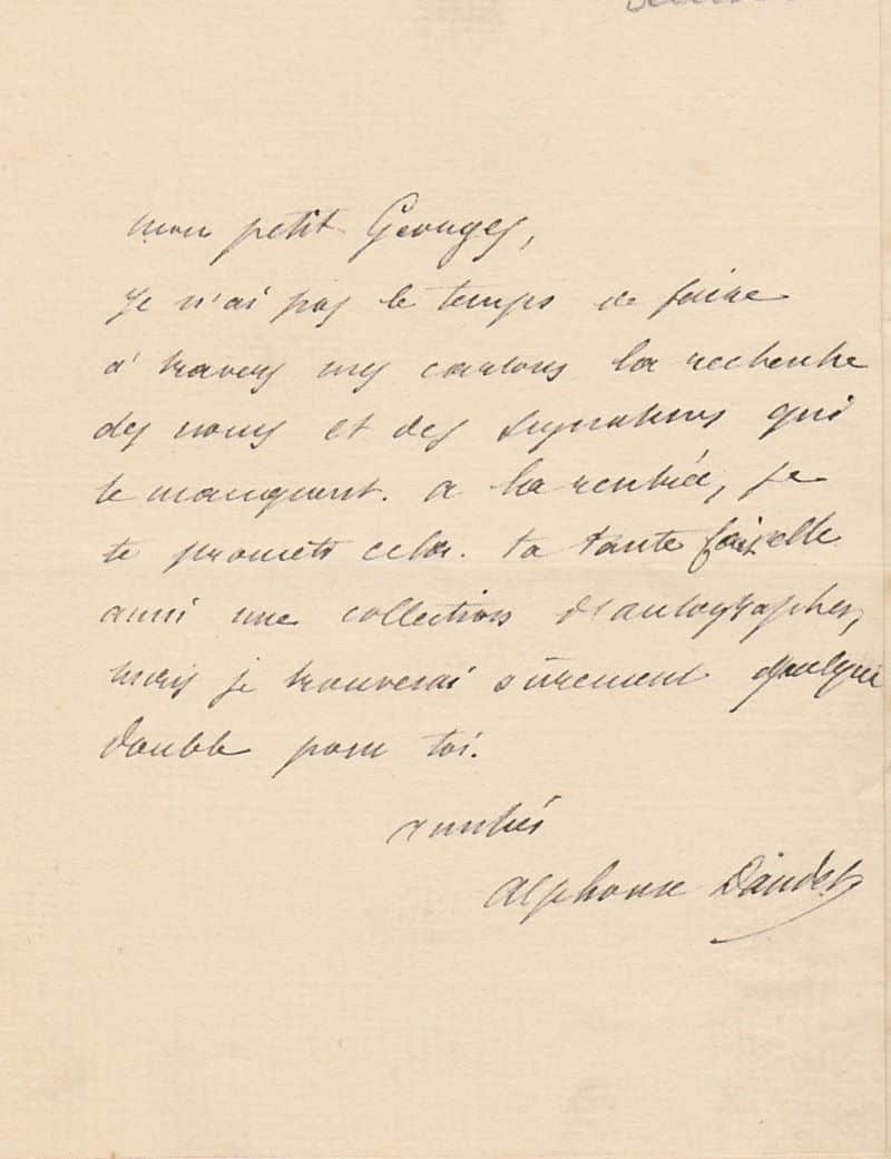 Daudet à la recherche d’autographes pour son petit Georges : « Je n’ai pas le temps de faire à travers mes cartons la recherche des noms et des inspirateurs qui te manquent. A la rentrée, je te promets cela. Ta tante fait-elle aussi une collection d’autographes, mais je trouverai sincèrement quelque double pour toi… »