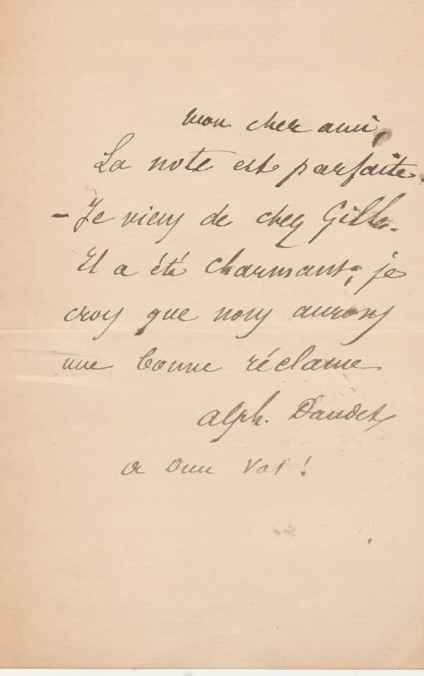 Daudet ravis de la réclame pour son livre : « La note est parfaite – Je viens de chez Gilles. Il a été charmant, je crois que nous aurons une bonne réclame Alph. Daudet A dieu Vat ! »