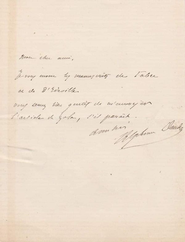 « Je vous envoie les manuscrits de Fabre et de d’Edville. Vous serez bien gentil de m’envoyer l’article de Zola, s’il paraît… »