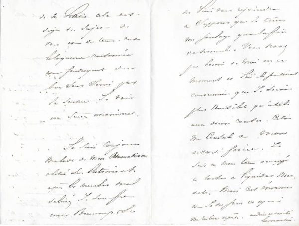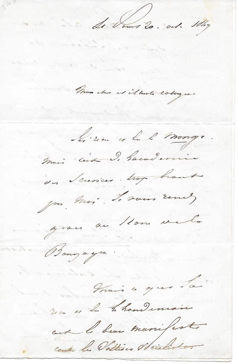 Lamartine a lu le « Monge ». « Mais c’est de l’Académie des Sciences. Trop haut pour moi. Je vous rends grâce au nom de la Bourgogne [Lamartine est originaire de Mâcon]. Mais ce que j’ai reçu et lu le lendemain c’est le beau manifeste contre les sottises socialistes de M. Pelletier. Cela est signe du sujet de vous et des leurs. C’est l’éloquence raisonnée et foudroyante du bon sens servi par la science. Je vois un succès unanime. Je suis toujours malade de mon rhumatisme sur l’estomac (…) Je souffre encore beaucoup et je ne puis vous rejoindre à supposer que le tems me soulage qu’à la fin de novembre. Vous n’avez pas besoin de moi en ce moment et j’ai le sentiment consciencieux que je serais plus nuisible qu’utile aux deux causes. Cela me console de mon oisiveté forcée (…) »