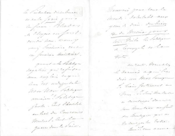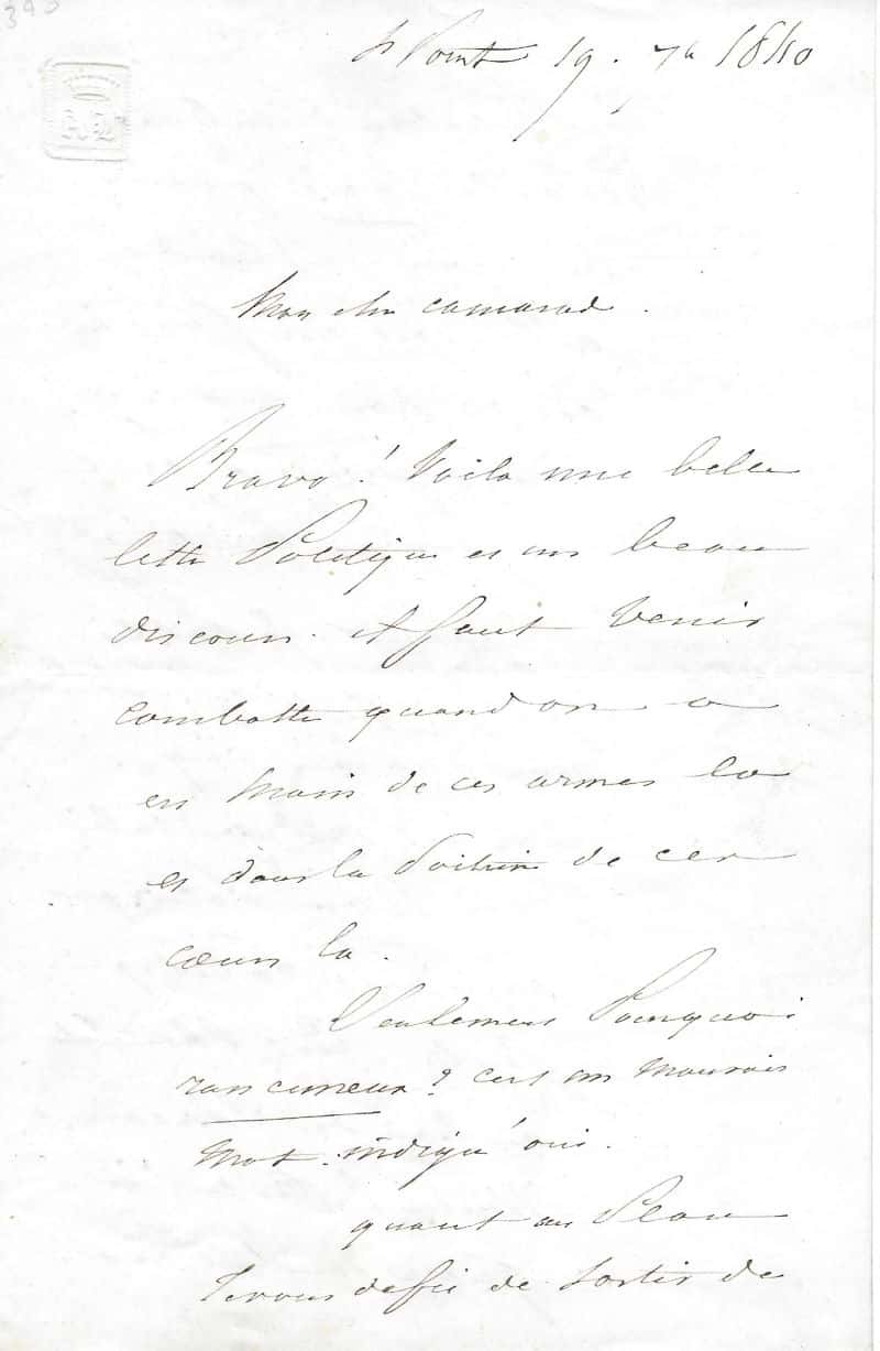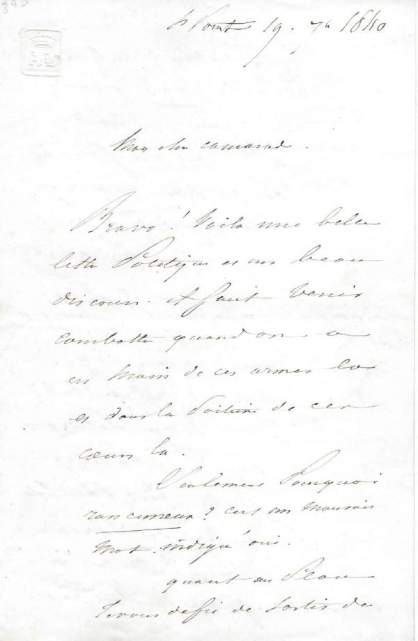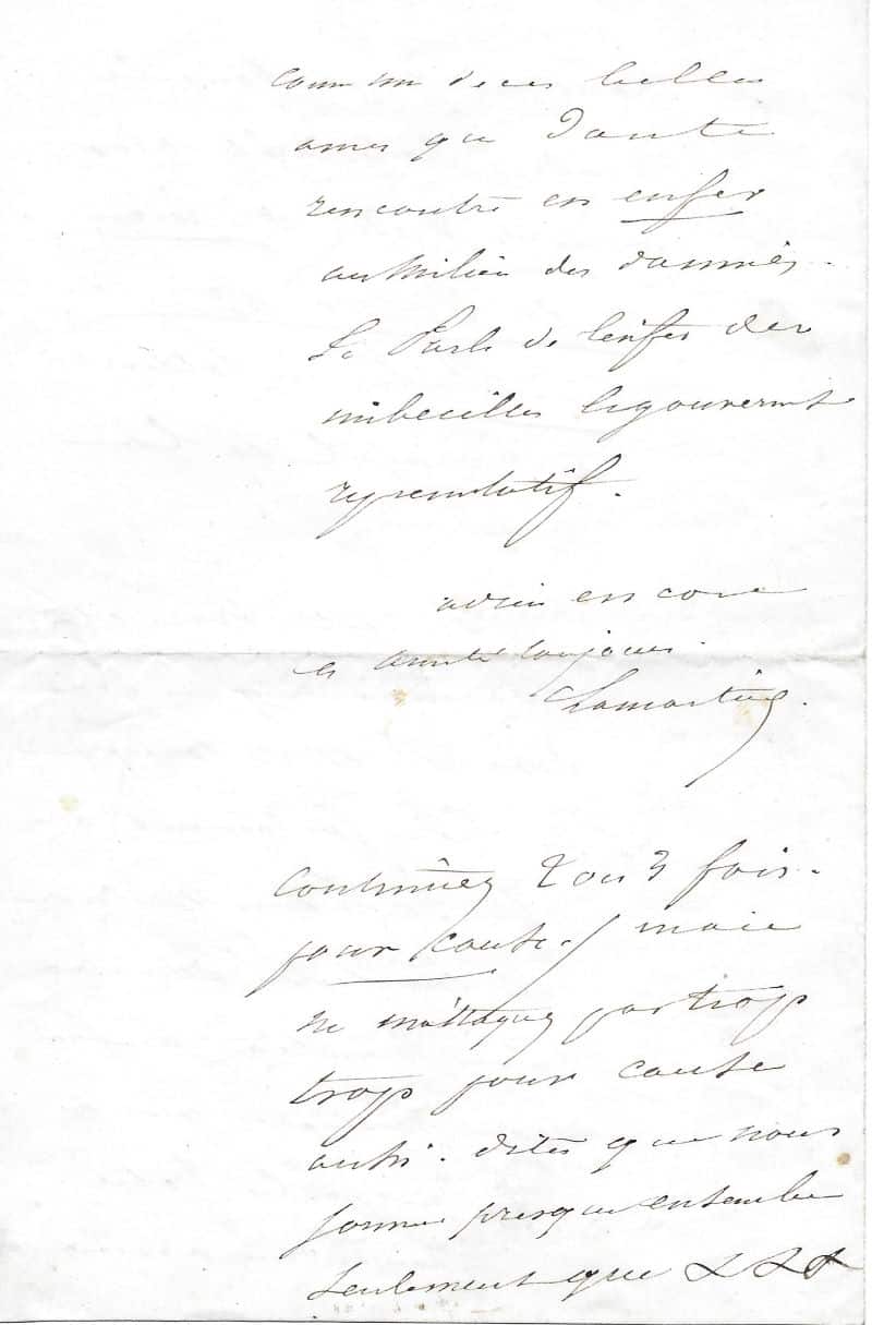 Belle lettre politique où se révèle Lamartine le défenseur des libertés, qui veut faire table rase du passé napoléonien : « Bravo ! Voilà une belle lettre politique et un beau discours. Il faut venir combattre quand on a en main de ces armes là et dans la poitrine de ces cœurs là. (…). Quand au plan je vous défie de sortir de la protection des Cabacés et de la Syrie pour la France. Rhodes et Chypre en sont. Candie non. Vous y serez prisonnier, c’est une souricière maritime. Quant à la politique négative qui refuse aux Anglais ce qui leur est indispensable, non non politique arriérée ! Politique fausse. (…) au lieu du concours mutuel. C’est la guerre dans la paix. Mauvais pour tout le monde. Détestable aux yeux de Dieu ou bien et du mieux pour tous. Voilà la politique de l’évangile et la vôtre. Au reste vous êtes le dernier à qui l’on dise un mot parce que je tiens fortement à vous. Je suis malade et enveloppé dans mon manteau au fond des montagnes qui ne valent pas les votre. Mais je vous assure comme une très belle âme que Dante rencontre en enfer au milieu des damnés. Je parle de l’enfer des imbéciles du gouvernement représentatif. Adieu encore et amitié toujours (…) »