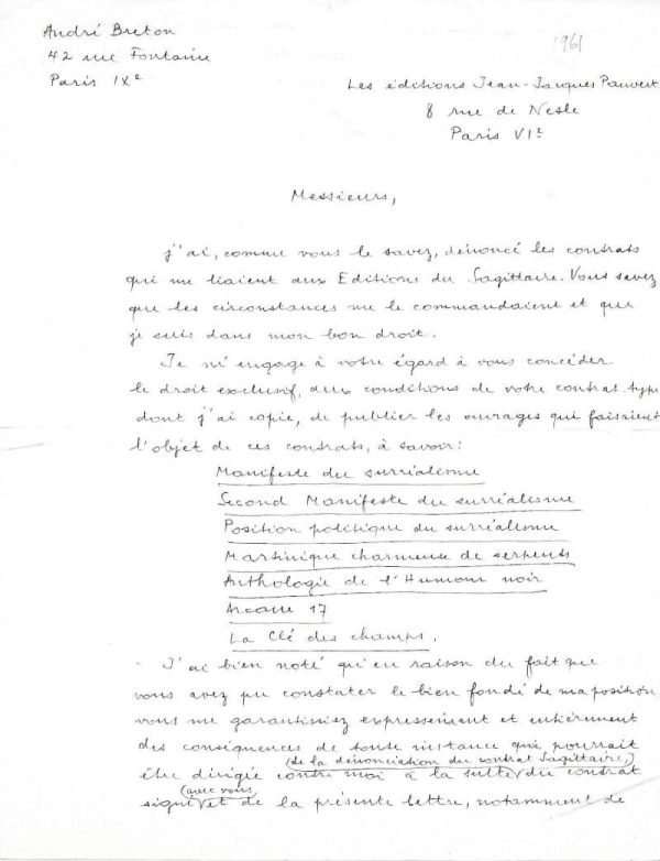 André Breton s’engage chez son nouvel éditeur sous certaines conditions : « Messieurs, J’ai, comme vous le savez, dénoncé les contrats qui me liaient aux Editions du Sagittaire. Vous savez que les circonstances me le commandaient et que je suis dans mon bon droit. Je m’engage à votre égard à vous concéder le droit exclusif, aux conditions de votre contrat type dont j’ai copie, de publier les ouvrages qui faisaient l’objet de ces contrats, à savoir : Manifeste du surréalisme Second Manifeste du surréalisme Position politique du surréalisme Martinique charmeuse de serpents Anthologie de l’humour noir Arcane 17 La clé des champs. J’ai bien noté qu’en raison du fait que vous avez pu constater le bien fondé de ma position vous me garantissiez expressément et entièrement des conséquences de toute instance qui pourrait être dirigée contre moi à la suite de la dénonciation du contrat Sagittaire, du contrat signé avec vous et de la présente lettre, notamment de toute condamnation. Vous vous engagez, en outre, à faire l’avance et à supporter définitivement tous les frais et honoraires que pourraient entrainer ces instances (…) »