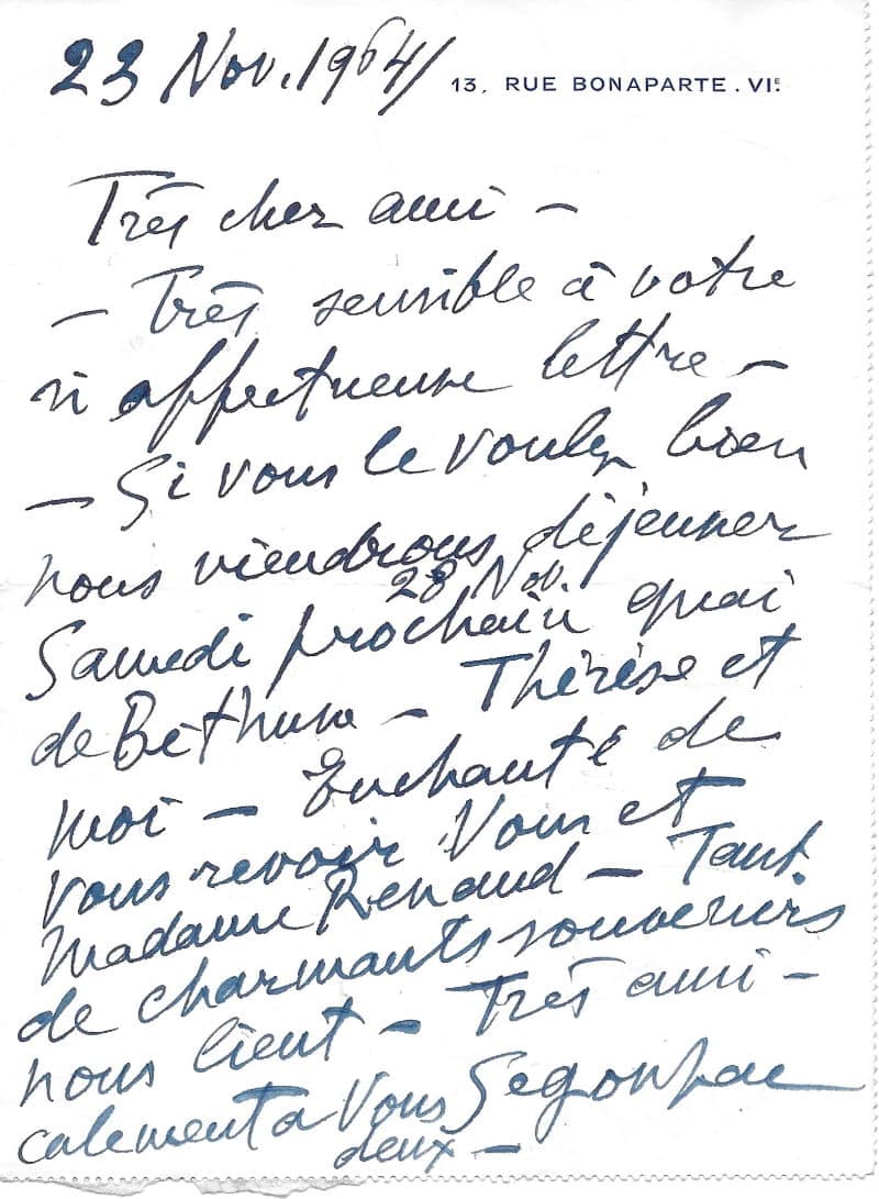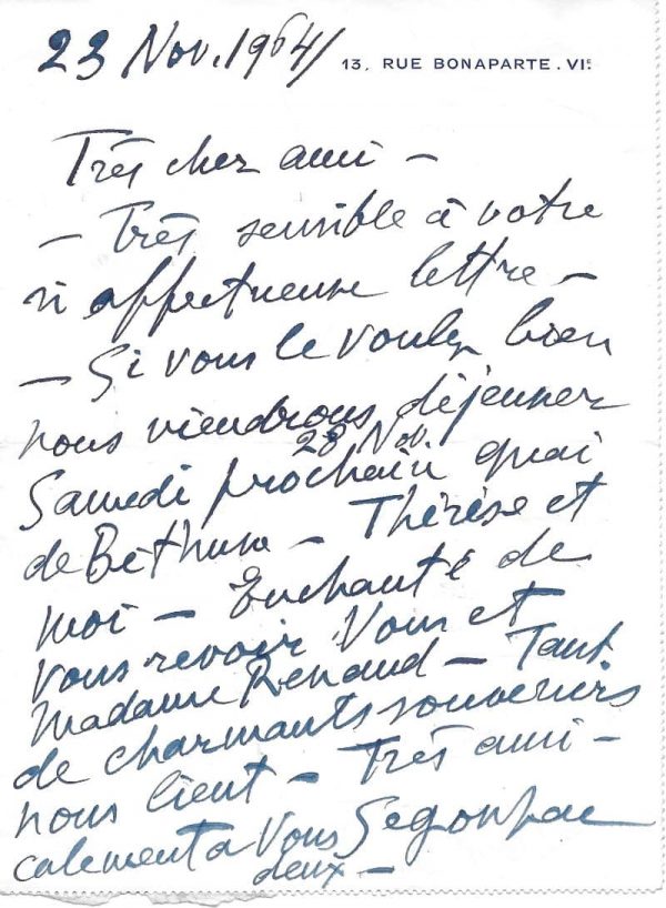 « Très sensible à votre si affectueuse lettre – Si vous le voulez bien nous viendrons déjeuner samedi prochain 28 Nov. Quai de Béthune – Thérèse et moi – Enchanté de vous revoir vous et Madame Renand – Tant de charmants souvenirs nous lient – Très amicalement à vous deux… »