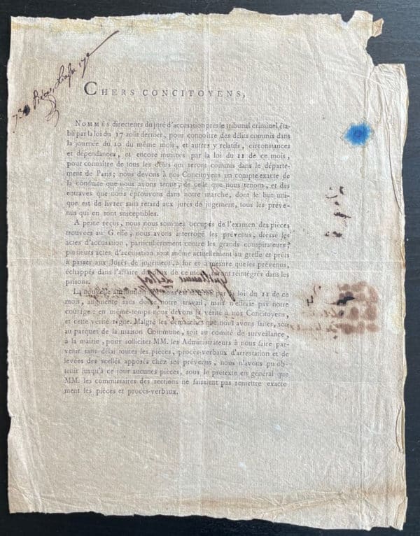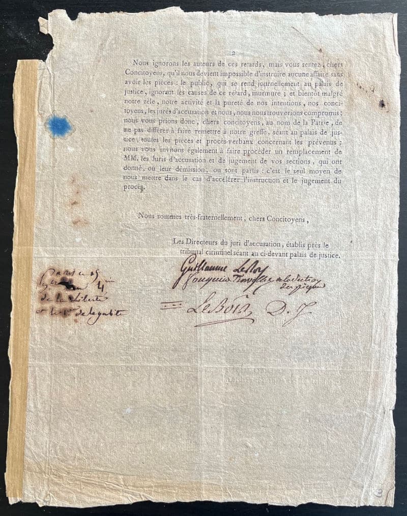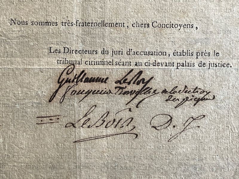 Pièce imprimée signée « Fouquier Tinville de la section des Piques » cosignée par les directeurs du jury d’accusation près le tribunal criminel, Guillaume Le Roy et Le Bois. Paris, 15 septembre jour 4ème de la liberté et de l’égalité (1792) ; 2 pages in-4°. Petit trou de corrosion en marge, effrangé, restes d’onglet sur un côté.