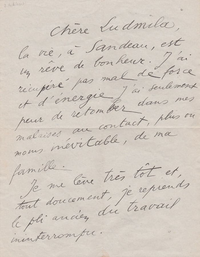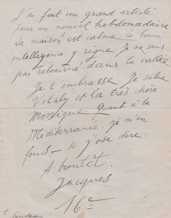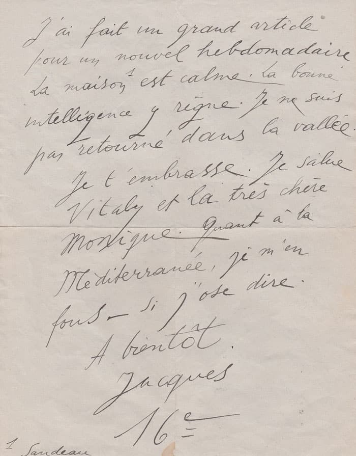 Au calme à Sandeau, Audiberti reprend goût au travail : «La vie à Sandeau, est un rêve de bonheur. J’ai récupéré pas mal de force et d’énergie j’ai seulement peur de retomber dans mes malaises au contact, plus ou moins inévitable, de ma famille. Je me lève très tôt et, tout doucement, je reprends le poli ancien du travail ininterrompu. J’ai fait un grand article pour un nouvel hebdomadaire. La maison Sandeau est calme. La bonne intelligence y règne. Je ne suis pas retourné dans la vallée. Je t’embrasse. Je salue Vitaly et la très chère Monique. Quant à la Méditerranée, je m’en fous – si j’ose dire… »