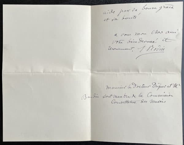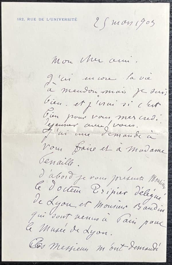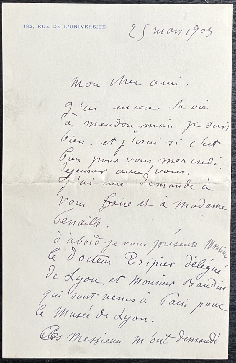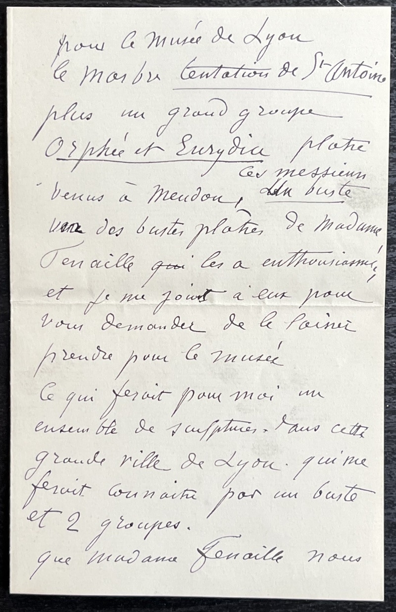 Auguste Rodin sollicite son ami et mécène, Maurice Fenaille, pour l’aider à concrétiser la vente de trois œuvres pour le musée des Beaux-Arts de Lyon, œuvres aujourd’hui présentes au musée : « J’ai encore la vie à Meudon, mais je suis bien et j’irai si c’est bien pour vous, mercredi déjeuner avec vous. J’ai une demande à vous faire et à Madame Fenaille. D’abord je vous présente Monsieur le docteur Tripier délégué de Lyon et Monsieur Baudin qui sont venus à Paris pour le Musée de Lyon. Ces messieurs m’ont demandé pour le Musée de Lyon le marbre Tentation de St Antoine plus un grand groupe Orphée et Eurydice plâtre. Ces messieurs venus à Meudon, un buste des bustes plâtres de Madame Fenaille qui les a enthousiasmés, et je me joins à eux pour vous demander de le laisser prendre pour le musée. Ce qui ferait pour moi un ensemble de sculptures dans cette grande ville de Lyon, qui me ferait connaître par un buste et 2 groupes. Que Madame Fenaille nous aide par sa bonne grâce et sa bonté. A vous mon cher ami votre dévoué et reconnaissant (…) Monsieur le docteur Tripier et Mr Baudin sont membres de la Commission Consultative des Musées »