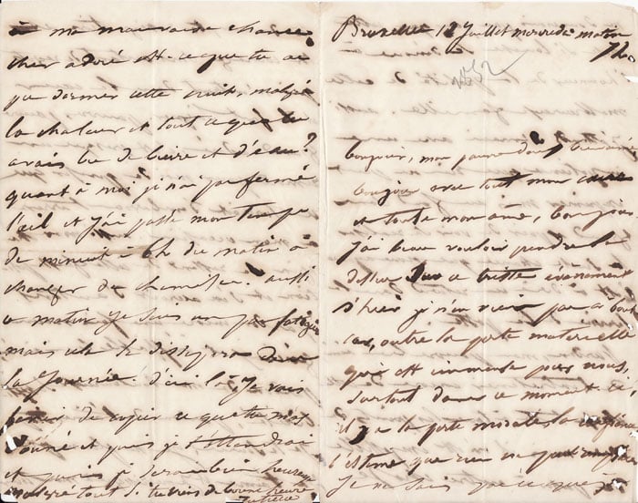 Lettre autographe signée « Juliette » à Victor HUGO. Bruxelles, mercredi matin 7h, 12 juillet 1852; 4 pages in-8. Quelques trous, corrosion résultant de l’encre et infimes déchirures.