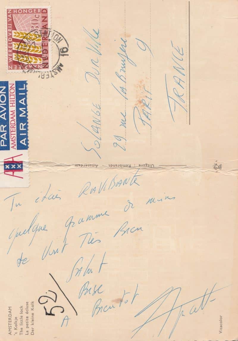 Carte autographe signée à la chanteuse Solange Durville. (Amsterdam) ; 1 page in-12° au dos d’une carte postale représentant « La petite écluse » à Amsterdam, avec enveloppe. Pliure.