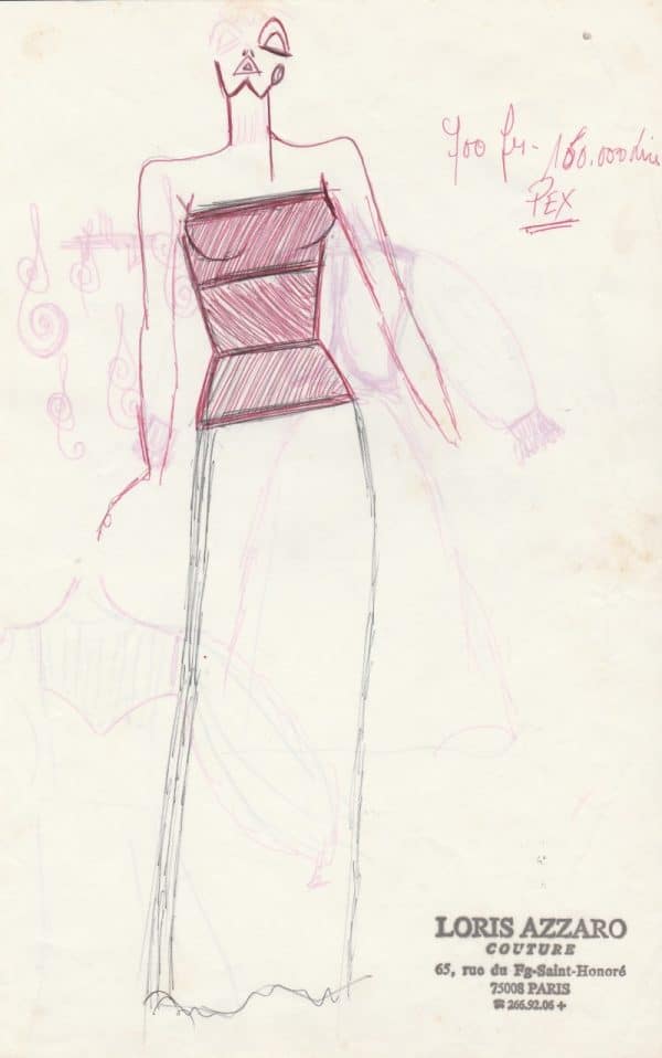 Croquis d’une robe au stylo bille rouge et à la mine de plomb.