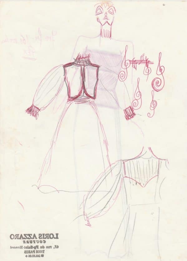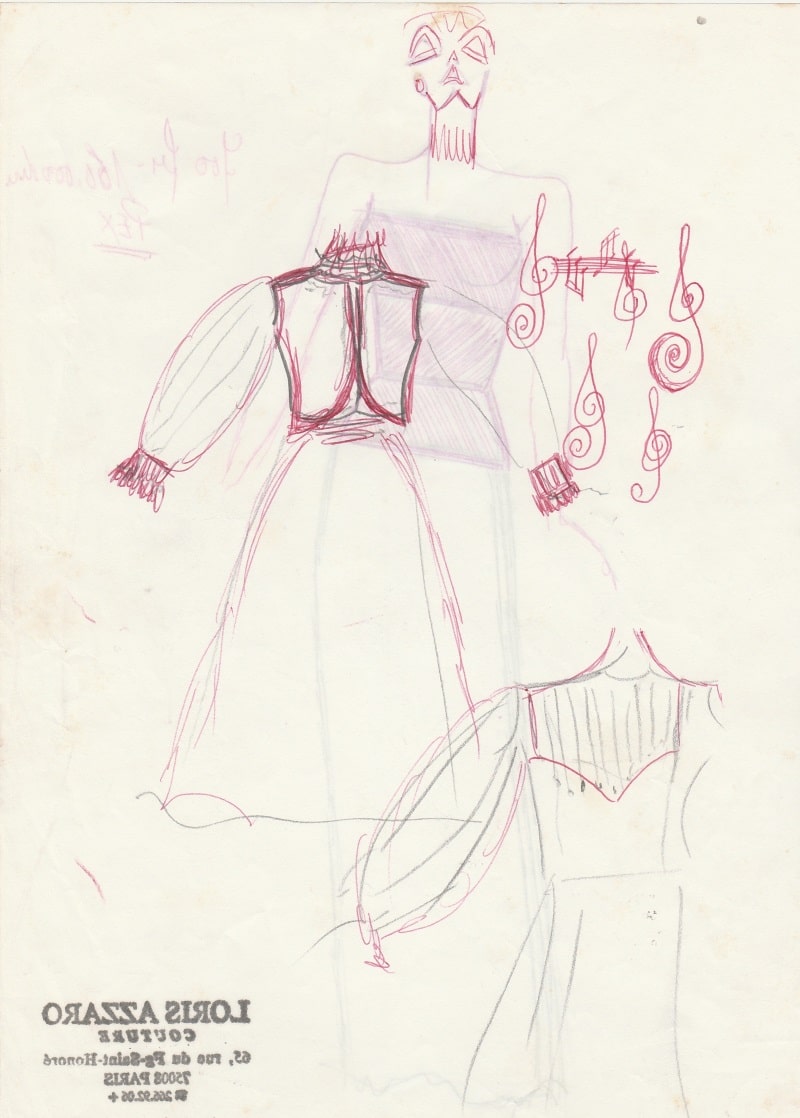 Au dos croquis de 2 robes accompagnées de clefs de sol