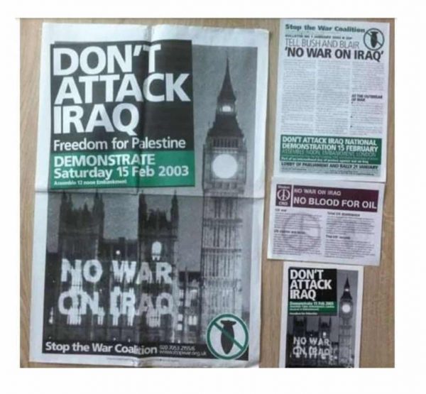 Autocollant au dos « Stop the War demonstrate Saturday 15 Feb 2003 12 noon, Embankment »