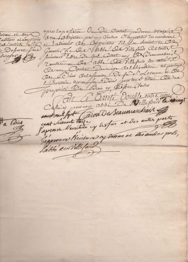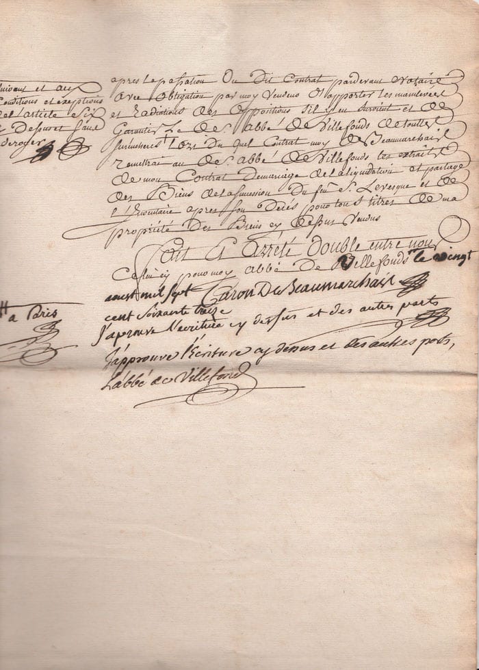 L’acte de vente est ainsi signé et approuvé par Caron de Beaumarchais et l’abbé de Villefonds, le 20 août 1773.