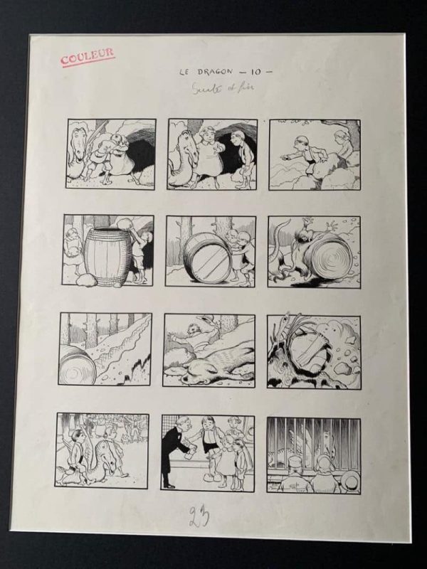 Planche originale signée à l’encre de chine sur papier, 42,3×31,8 cm, titré « Le Dragon – 10 – », tampon rouge « couleur » en haut à gauche, numéroté 23 en bas de planche. Légère pliure dans l’angle gauche, bon état dans l’ensemble.