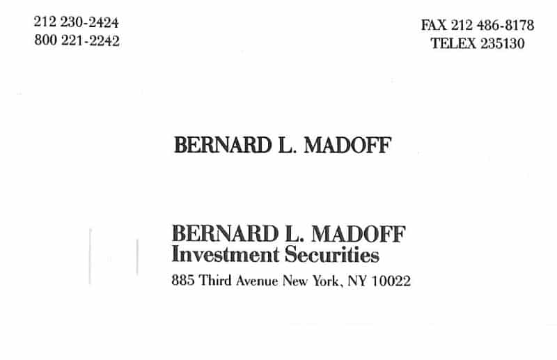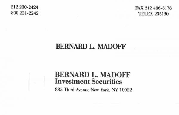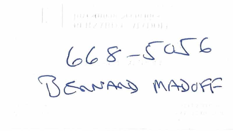 Carte de visite à l’adresse de sa société d’investissement à Wall Street « Bernard L. Madoff Investment Securities » avec mention autographe de son numéro de téléphone personnel : « 668 – 5056 Bernard Madoff »