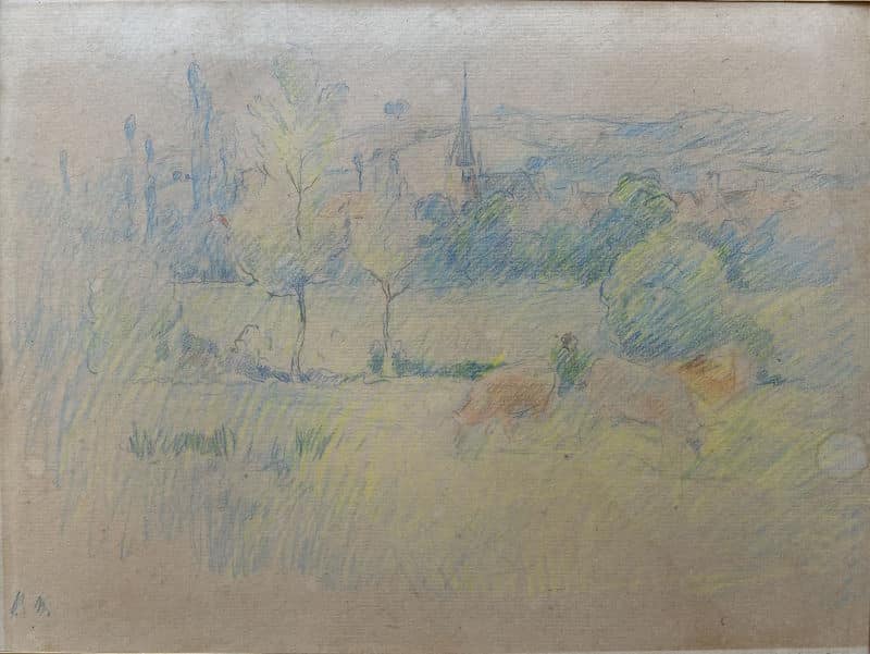 Dessin au crayon de couleurs, signé des initiales en bas à gauche.