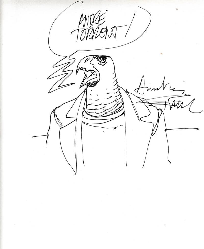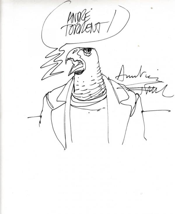 Dessin original au feutre dédicacé et signé au dos de la page de garde de l’album « La Femme Piège », 22,3 x 26,9 cm.