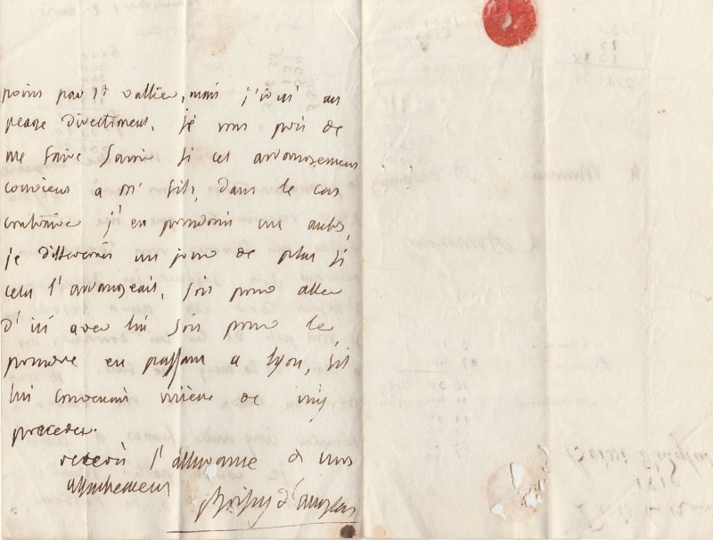 Pendant la période des Cents jours, Boissy-d’Anglas prépare son retour à Paris rejoindre l’empereur, après s’être rallié à Louis XVIII suite à la première abdication : « (…) Ma femme vous demande pendant son séjour ici, successivement l’argent dont elle aura besoins, je vous prie de le lui donner, ou à mad de la Mery ma fille. Je vous prie en outre de me faire compter cinq mille francs à Paris, je compte partir mardi. » Il conclut sa lettre sur les modalités de son voyage jusqu’à Paris en passant par Lyon.