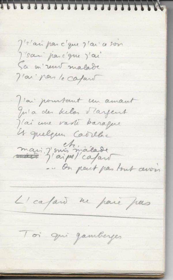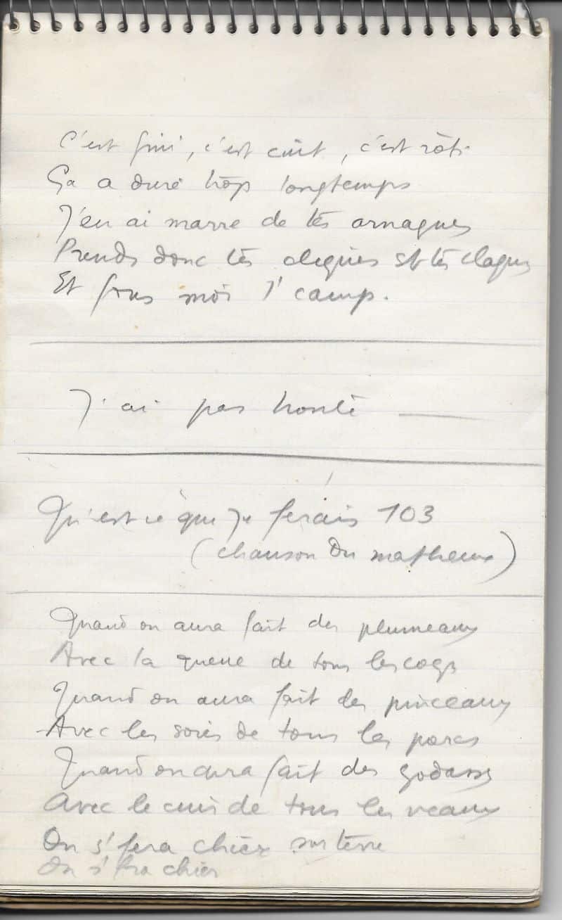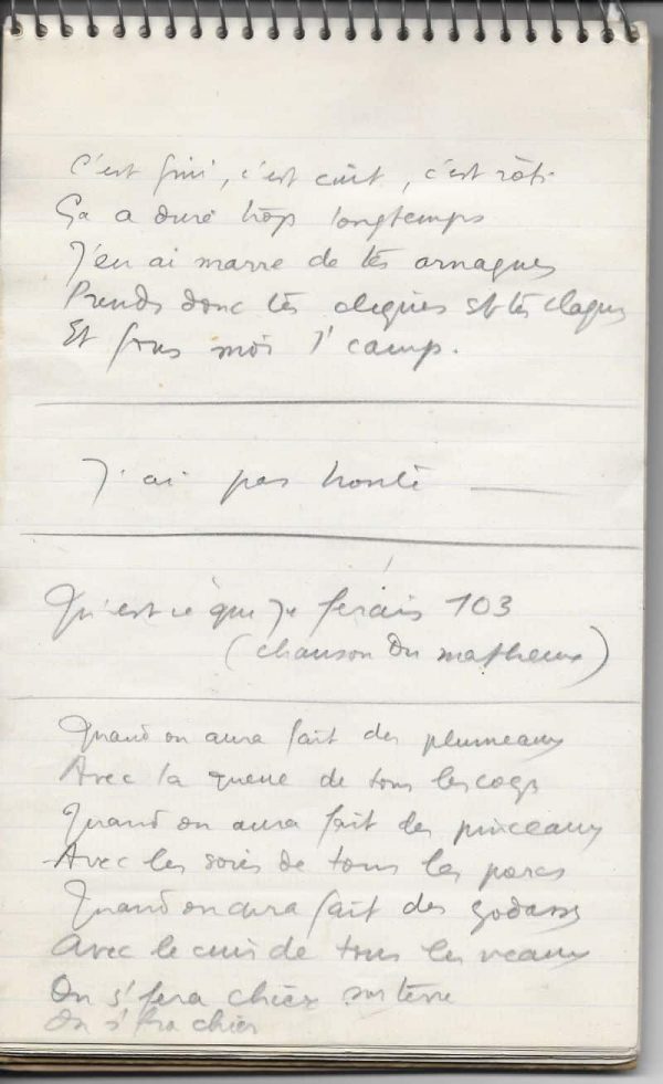 Rare et précieux carnet beige à spirales entièrement empli d’une vingtaine de chansons écrites au crayon à papier sur le recto de chaque feuillet, le tout en très bon état. Pour la plupart ce sont des ébauches plus ou moins aboutis, parfois quelques phrases annotées entre deux chansons. Au fil des mots, on retrouve l’esprit, la gouaille, la provocation dont savait user l’écrivain et chanteur, figure emblématique du quartier latin d’après-guerre.