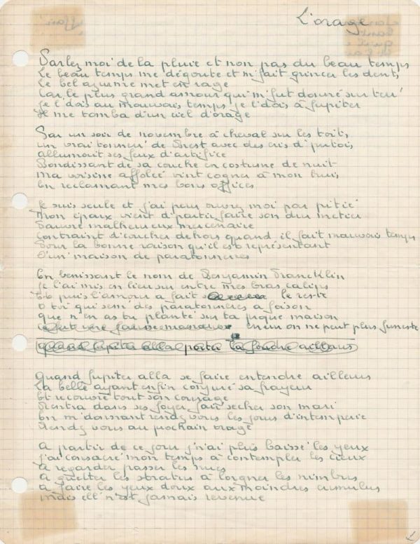 Manuscrit autographe « L’Orage ». 1 page ¼ in-4° sur papier quadrillé comportant des trous de classeur en marge sans atteinte au texte. Manuscrit biffé avec corrections.