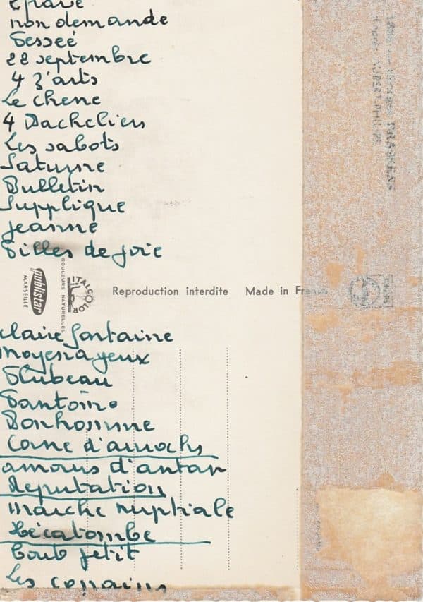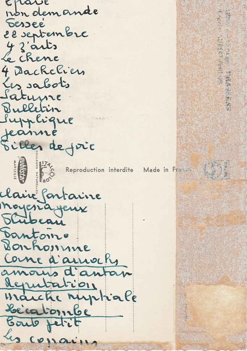 Pièce autographe. S.n.l.d.; 1 page in-12 au dos d’une carte postale, traces d’usure.