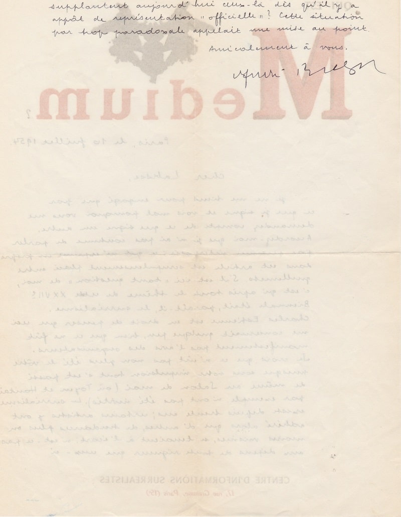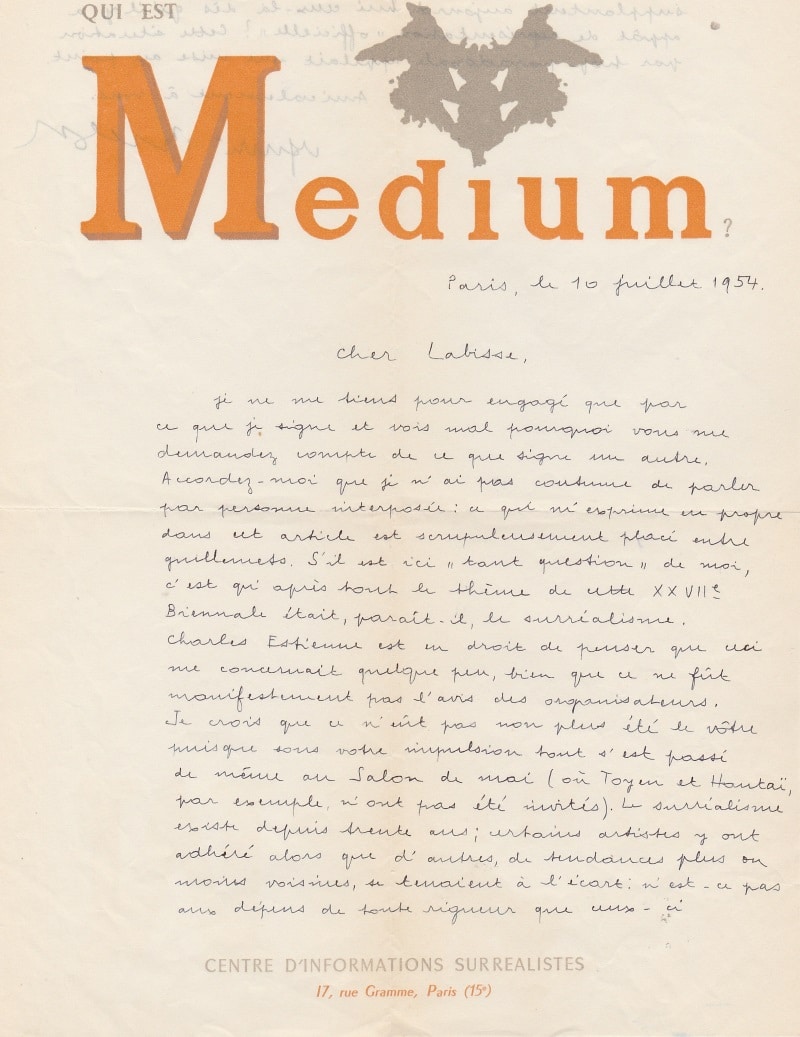 Lettre autographe signée au peintre surréaliste Félix Labisse. Paris, 10 juillet 1954 ; 1 page ¼ in-4° sur papier en-tête « Qui est Medium ? »