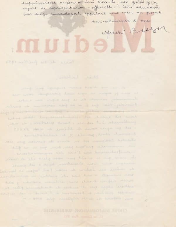 Lettre d’importance sur la position ferme de Breton face aux manifestations dissidentes au mouvement surréaliste de son fondateur : « Je ne me tiens pour engagé que par ce que je signe et vois mal pourquoi vous me demandez compte de ce que signe un autre. Accordez-moi que je n’ai pas coutume de parler par personne interposée : ce qui m’exprime en propre dans cet article est scrupuleusement placé entre guillemets. S’il est ici « tant question » de moi, c’est qu’après tout le thème de cette XXVIIe Biennale était, parait-il, le surréalisme. Charles Estienne est en droit de penser que ceci me concernait quelque peu, bien que ce ne fût manifestement pas l’avis des organisateurs. Je crois que ce n’eût pas non plus été le vôtre puisque sous votre impulsion tout s’est passé de même au Salon de mai (où Toyen et Hantaï, par exemple, n’ont pas été invités). Le surréalisme existe depuis trente ans ; certains artistes y ont adhéré alors que d’autres, de tendances plus ou moins voisines, se tenaient à l’écart : n’est-ce pas aux dépens de toute rigueur que ceux-ci supplantent aujourd’hui ceux-là dès qu’il y a appât de représentation « officielle » ? Cette situation par trop paradoxale appelait une mise au point… »