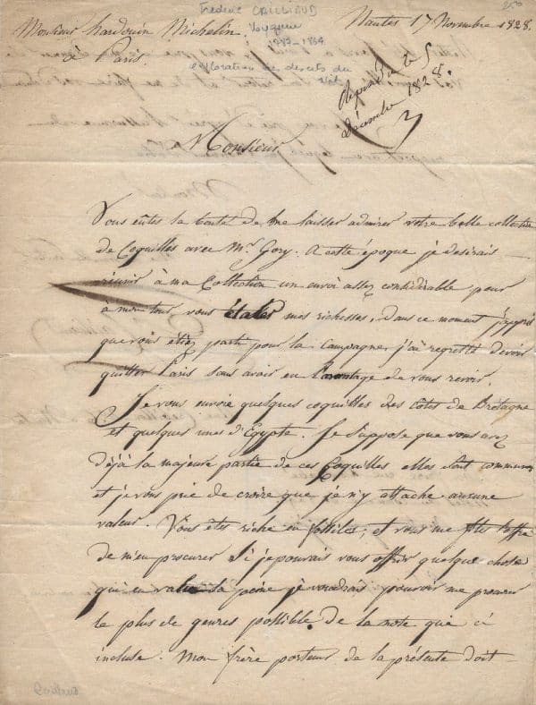A ses débuts, Frédéric Cailliaud participe à deux expéditions en Egypte, l’une de 1815 à 1818 et l’autre de 1819 à 1822. Il ramène une collection d’environ 1000 pièces de ses voyages en terre égyptienne. Il est gratifié de la légion d’honneur sous Charles X en 1824. De retour en France, il se passionne pour l’histoire naturelle et étudie notamment les mollusques qui perforent les coques en bois des navires : « Vous eûtes la bonté de me laisser admirer votre belle collection de coquilles avec Mr Gory. A cette époque je désirais réunir à ma collection un envoi assez considérable pour à mon tour vous étaler mes richesses. Dans ce moment j’appris que vous étiez parti pour la campagne. J’ai regretté devoir quitter Paris sans avoir en l’avantage de vous revoir. Je vous envoie quelques coquilles des côtes de Bretagne et quelques une d’Egypte. Je suppose que vous avez déjà la majeure partie de ces coquilles elles sont communes et je vous prie de croire que je n’y attache aucune valeur. Vous êtes riche en fossiles ; et vous me faites l’offre de m’en procurer si je pouvais vous offrir quelque chose qui en valu la peine je voudrais pouvoir me procurer le plus de genres possible ( …) »