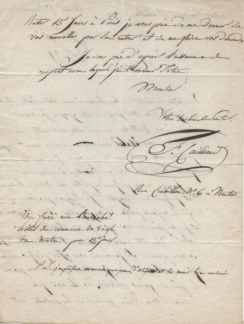 Lettre autographe signée à Monsieur Hardouin Michelin, conseiller à la cour des comptes. Nantes 17 novembre 1828 ; 2 pages in-4°, adresse en quatrième page.