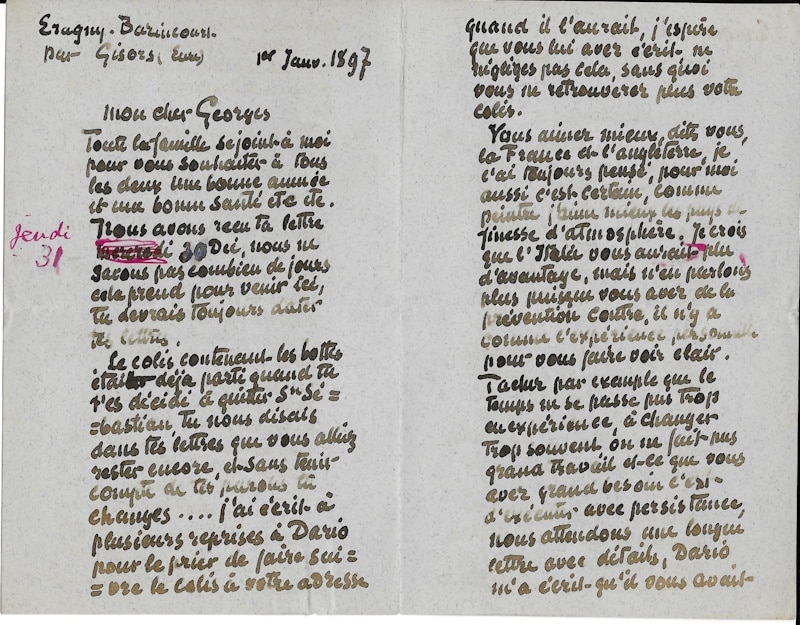 Lettre autographe signée à son fils Georges (Manzana-Pissarro). Eragny-Bazincourt 1e janvier 1897 ; 2 pages et demie in-8° (une correction de date à l’encre rouge possiblement de la main de Georges)
