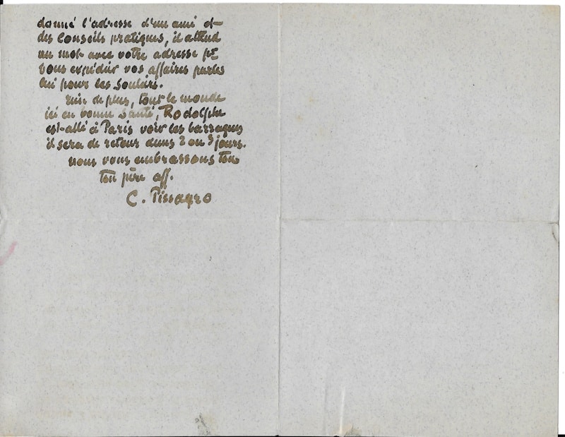 Lettre de vœux et de conseils artistiques à son fils, le peintre Georges Mazana-Pissarro : « Mon cher Georges, Toute la famille se joint à moi pour vous souhaiter à tous les deux une bonne année et une bonne santé etc etc. Nous avons reçu ta lettre mercredi 30 déc [biffure à l’encre rouge d’une autre main avec correction de date au jeudi 31), nous ne savons pas combien de jours cela prend pour venir ici, tu devrais toujours dater tes lettres. Le colis contenant les bottes était déjà parti quand tu t’es décidé à quitter San Sébastian. Tu nous disais dans tes lettres que vous alliez rester encore, et sans tenir compte de tes paroles tu changes…J’ai écrit à plusieurs reprises à Dario [le peintre espagnol de Regoyos] pour le prier de faire suivre les colis à votre adresse quand il l’aurait, j’espère que vous lui avez écrit ne négligez pas cela, sans quoi vous ne retrouverez plus votre colis. Vous aimez mieux, dites vous, la France et l’Angleterre, je l’ai toujours pensé, pour moi aussi c’est certain, comme peintre j’aime mieux les pays de finesse d’atmosphère. Je crois que l’Italie vous aurait plu d’avantage, mais n’en parlons plus puisque vous avez de la prévention contre, il n’y a comme l’expérience personnelle pour vous faire voir clair. Tachez par exemple que le temps ne passe pas trop en expérience, à changer trop souvent on ne fait pas grand travail et ce que vous avez grand besoin c’est d’exécuter avec persistance, nous attendons une longue lettre avec détails, Dario m’a écrit qu’il vous avait donné l’adresse d’un ami et des conseils pratiques, il attend un mot avec votre adresse pour vous expédier vos affaires parles lui pour les souliers. Rien de plus, tout le monde ici en bonne santé, Rodolphe est allé à Paris voir les barraques il sera de retour dans 2 ou 3 jours. Nous vous embrassons tous. Ton père aff…»