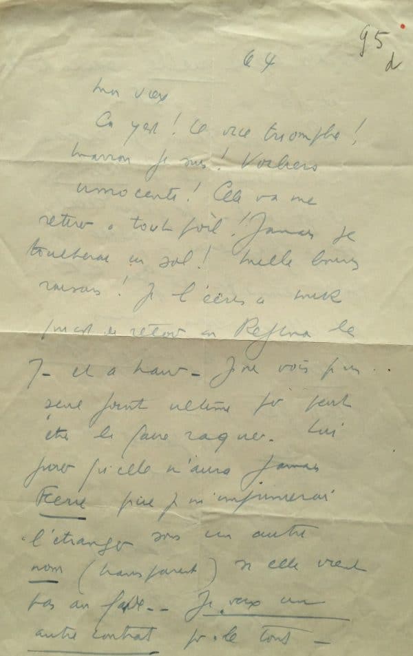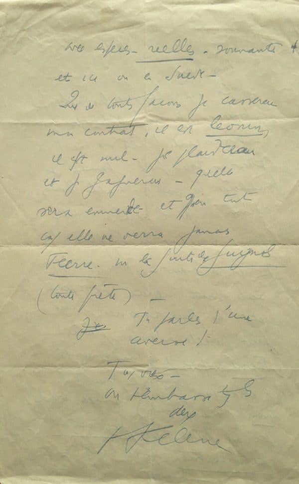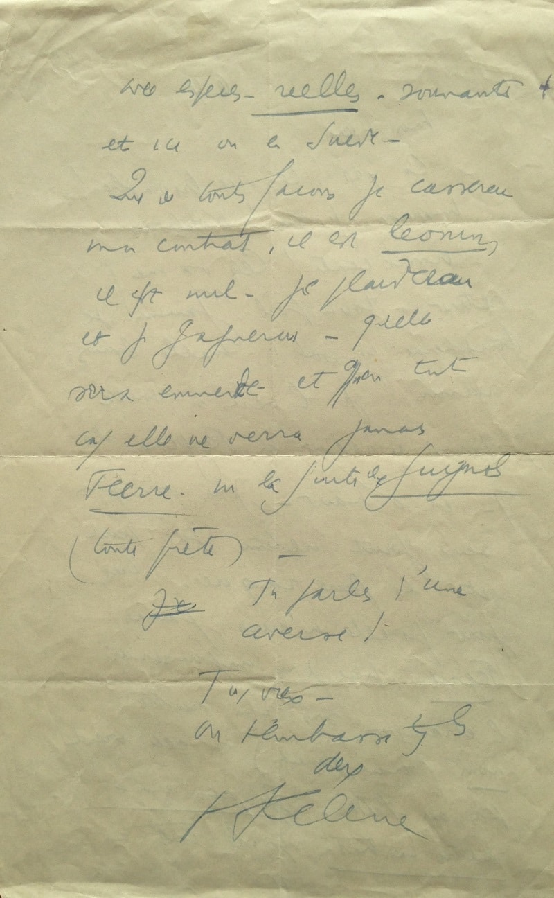 Belle lettre de Céline dans son exil forcé qui peste contre les nouveaux dirigeants des éditions Denoël, éditions reprises après l’assassinat de Robert Denoël en 1945 à la libération, qui pense-t-il essayent de lui jouer un mauvais tour pour la prochaine sortie de « Féérie pour une autre fois » écrit au Danemark. Le livre sort finalement à son retour en France aux éditions Gallimard le 27 juin 1952, Gaston Gallimard ayant fait des pieds et des mains pour récupérer Céline : « Ça y est ! le vice triomphe ! Larron je suis ! voiliers innocents ! Elle va me retirer. Tout poil ! Jamais je toucherai un sol ! Mille bonnes raisons ! (…) Je ne vois qu’un seul point ultime qui peut être le faire raquer. Lui jouer qui elle n’aura jamais Féérie pire je m’imprimerai à l’étranger sous un autre nom (transparent) si elle vient pas au fait…Je veux un autre contrat pour le tout – avec espèces – réelles « sonnante (…) De toutes façon je casserai mon contrat, il est léonin et nul – Je plaiderai et je gagnerai – qu’elle sera emmerdée et qu’en tout cas elle ne verra jamais Féérie ni la suite de Guignols (toute prête). Tu parles d’une averse ! … »