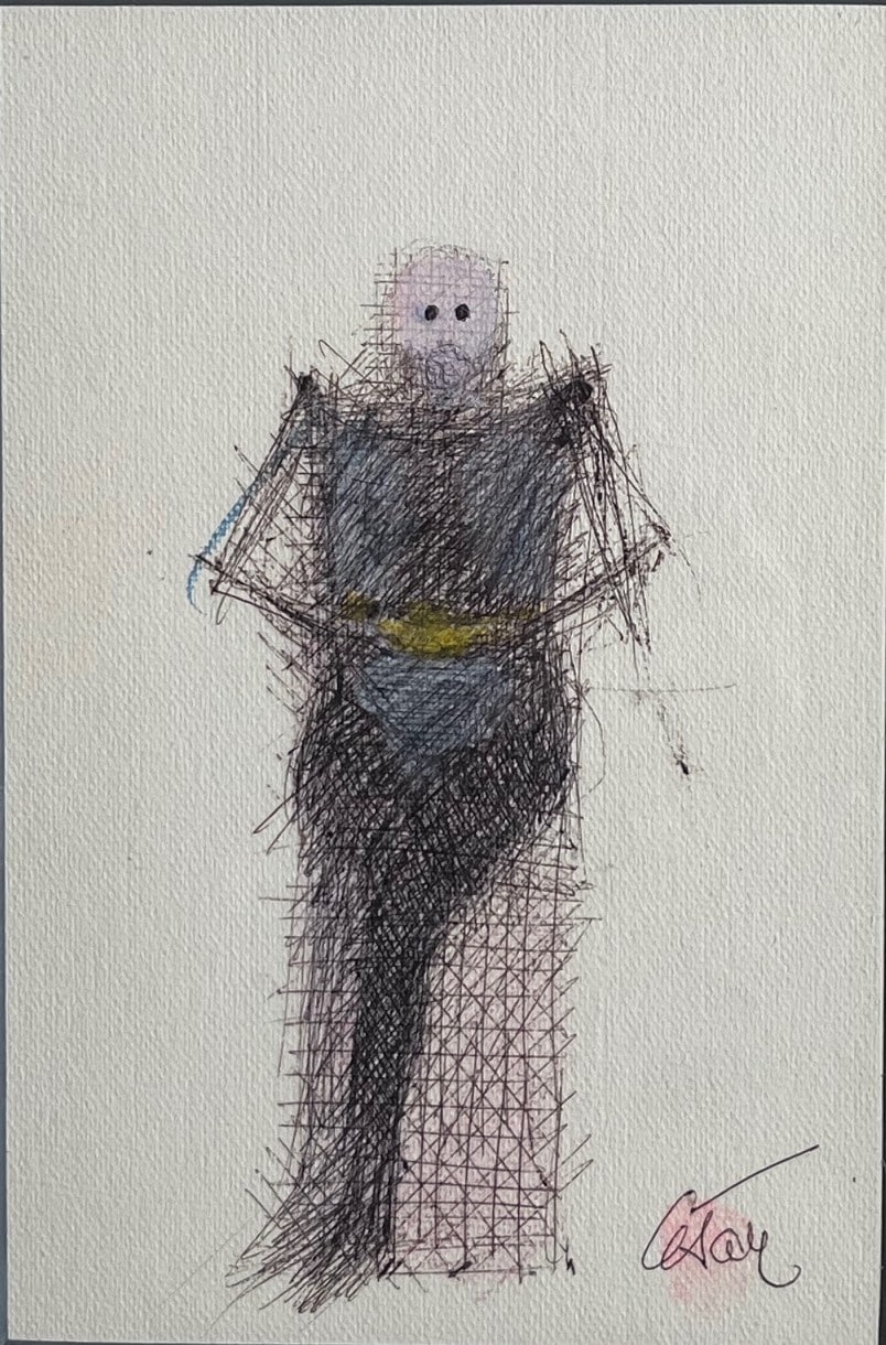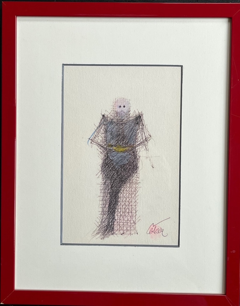 Dessin aux stylo bille et crayons gras sur papier signé en bas à droite sur empreinte digitale