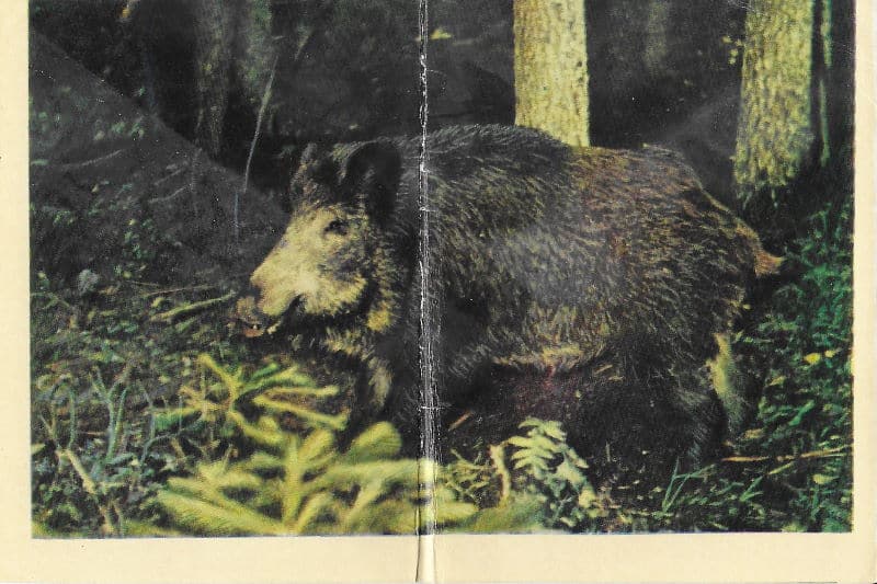 Carte autographe signée à la chanteuse Solange Durville. (Moscou, Théâtre Tchaïkovski) ; 1 page in-12° au dos d’une carte postale représentant un sanglier dans la forêt Belaya Vezha, avec enveloppe. Pliure.