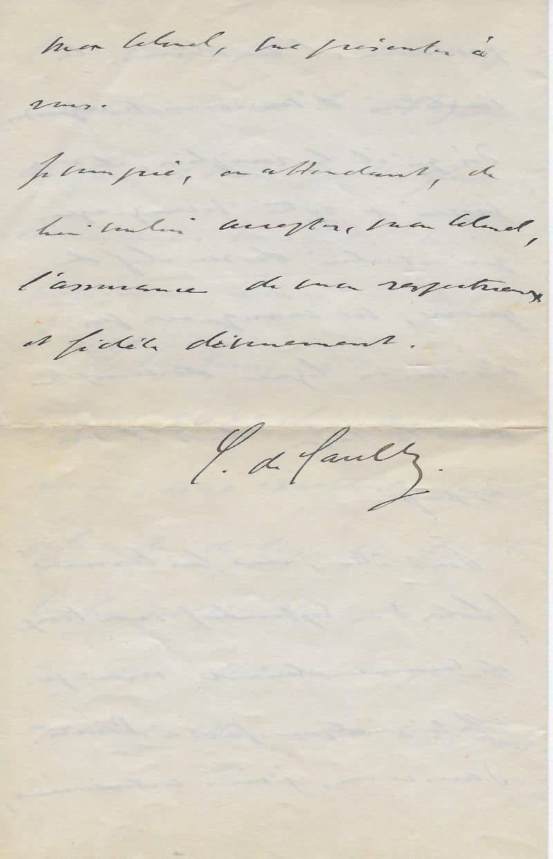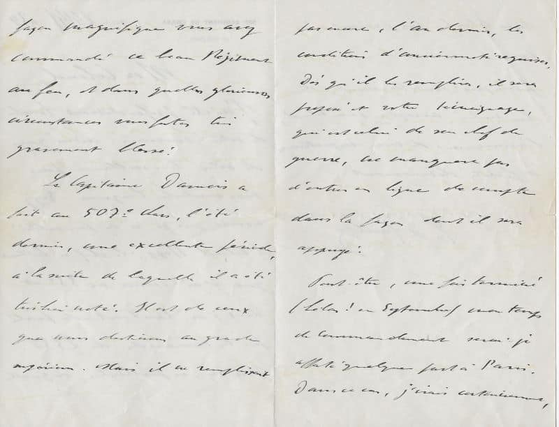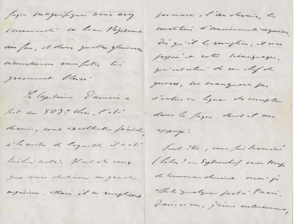 Belle et rare lettre du colonel de Gaulle à son ancien camarade du 33e régiment d’infanterie durant la première guerre mondiale, lettre écrite juste quelques mois avant que n’éclate le second conflit avec l’Allemagne qui changea à jamais la destinée du futur général de Gaulle : « Mon Colonel, J’ai été profondément touché de votre souvenir, ainsi que de votre bienveillance pour mon modeste bouquin [« La France et son armée »]. Soyez assuré que je n’ai pas oublié le Colonel Hepp, le chef si brillant que j’ai connu au 33e et dont j’ai tant entendu parlé par les camarades du 233e. J’ai su, en particulier, de quelle façon magnifique vus avez commandé ce beau régiment au feu, et dans quelles glorieuses circonstances vous fûtes très grièvement blessé. Le Capitaine Darmois a fait au 573e class, l’été dernier, une excellente période à la suite de laquelle il a été très bien noté. Il est de ceux que nous destinons au grade supérieur. Mais il ne remplissait pas encore, l’an dernier, les conditions d’ancienneté requises. Dès qu’il les remplira, il sera proposé et votre témoignage, qui est celui de son chef de guerre, ne manquera pas d’entrer en ligne de compte dans la façon dont il sera appuyé. Peut-être, une fois terminé (hélas ! en septembre) mon temps de commandement serai-je affecté quelque part à Paris. Dans ce cas, j’irais certainement. Mon Colonel, vous présenter à vous. Je vous prie, en attendant, de bien vouloir accepter, mon Colonel, l’assurance de mes respectueux et fidèles dévouement… »