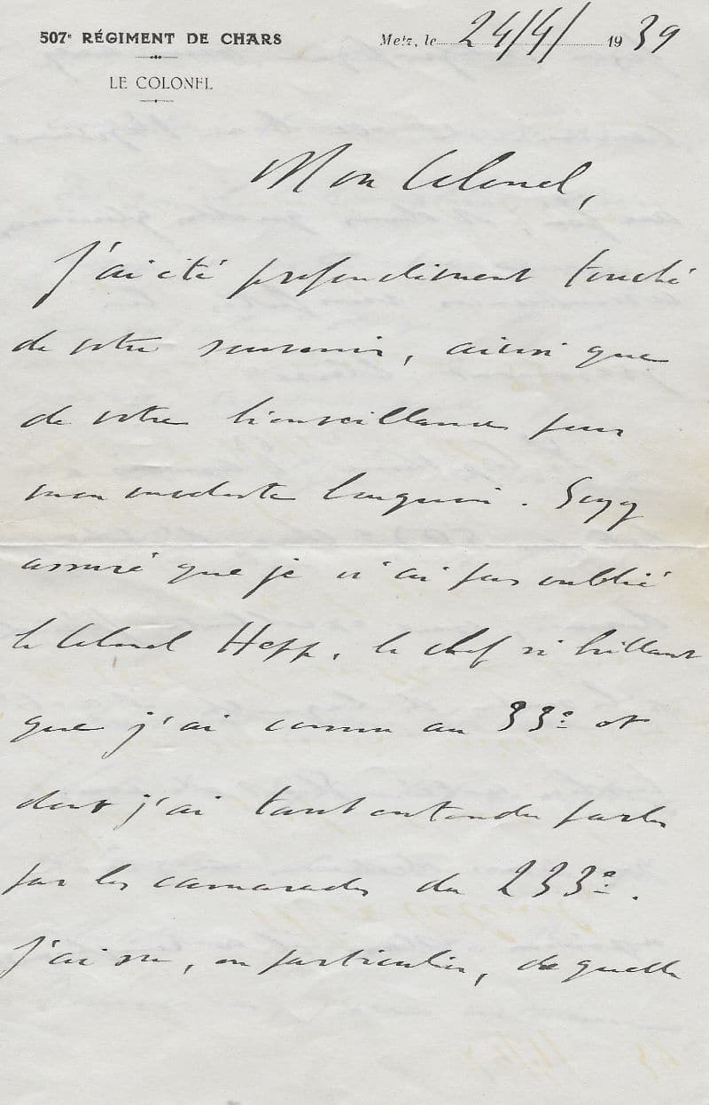 Lettre autographe signée au colonel Achille-Philippe Hepp. 24 avril 1939 ; 3 pages ½ in-8° sur papier en-tête du Colonel 507e régiment de chars.