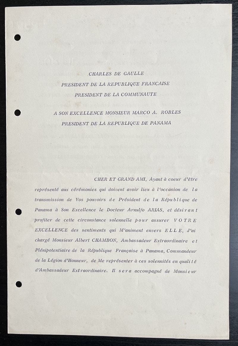 Le président Charles de Gaulle ne pouvant se rendre au Panama pour assister à la passation entre l’ancien président, Monsieur Marco A. Robles, et le nouveau le docteur Arnulfo Arias, se fera représenter, lors de la cérémonie, par Monsieur Albert Chambon, ambassadeur extraordinaire et plénipotentiaire de la république française à Panam et le vice-consul.