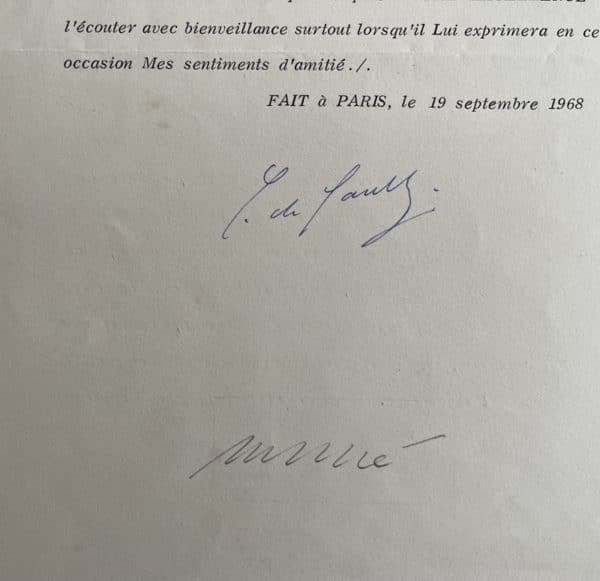 La lettre est datée du 19 septembre 1968 soit quatre mois après les évènements de mai 68. Michel Debré, père de la Constitution, était à cette époque ministre des affaires étrangères (1968 – 1969)