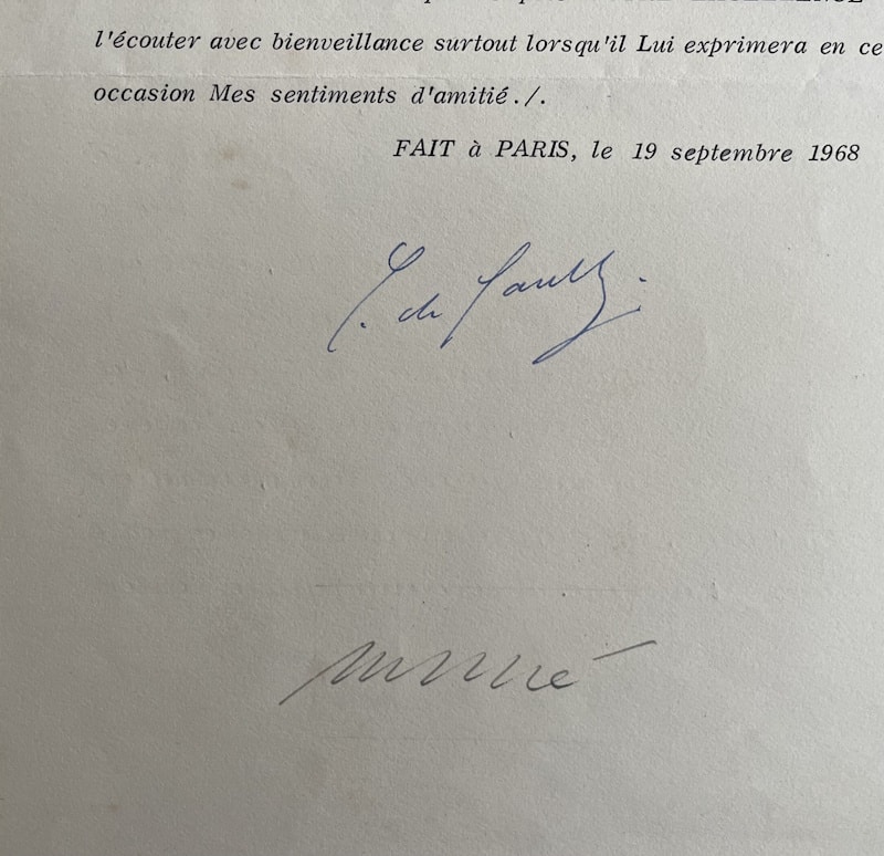 Lettre cosignée par Charles de Gaulle et Michel Debré à son excellence Monsieur Marco A. Robles président de la république du Panama. Paris 19 septembre 1968 ; 2 pages in-folio (31 x 21 cm).