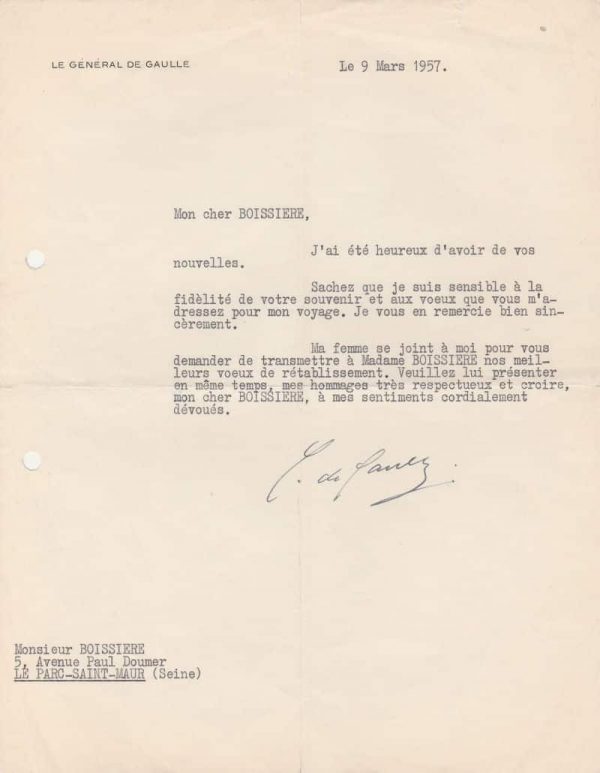 Lettre dactylographiée signée à son gendre, le commandant Boissière. 9 mars 1957 ; ½ page in-4° sur papier en-tête Le Général de Gaulle. Trous de classeur en marge qui n’affectent pas le texte.