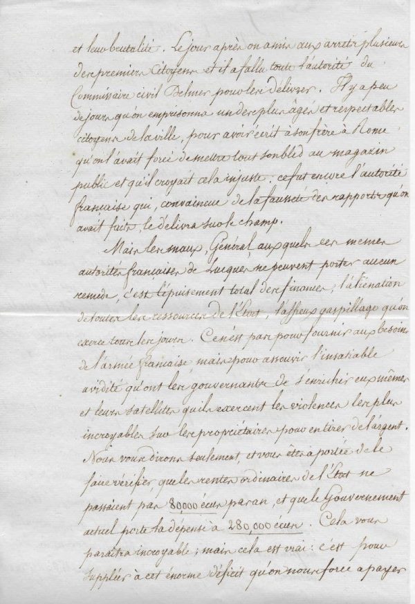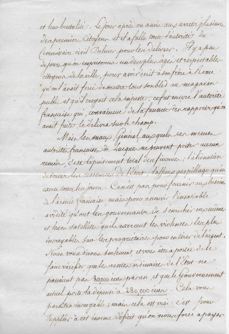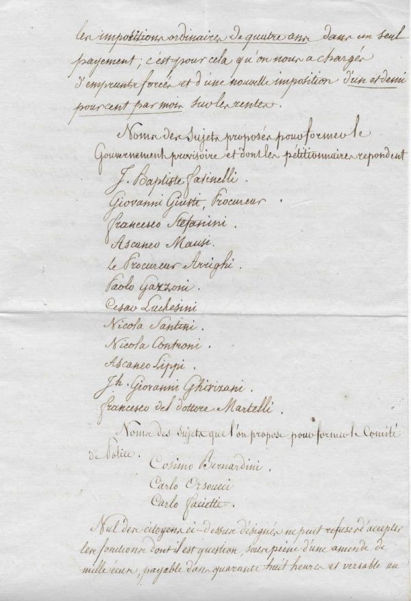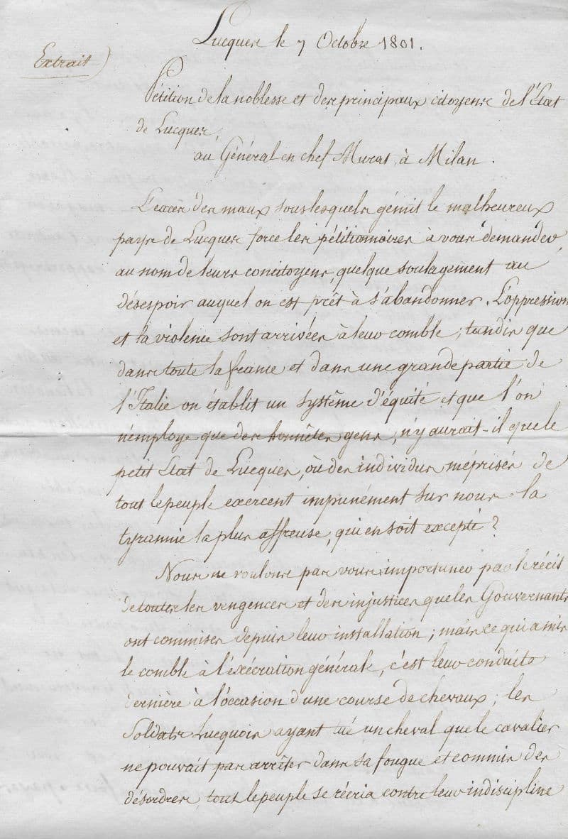 Victimes de la tyrannie et de la dilapidation des finances publiques, les habitants de l’état de Lucques demandent sans plus attendre un changement de gouvernance : « L’excès des maux sous lesquels gémit le malheureux pays de Lucques force les pétitionnaires à vous demander au nom de leurs citoyens quelque soulagement du désespoir auquel on est prêt à s’abandonner. L’oppression et la violence sont arrivées à leur comble ; tandis que dans toute la France et dans une grande partie de l’Italie on établit un système d’équité et que l’on employe que des honnêtes gens, n’y aurait-il que le petit état de Lucques ou des individus méprisés de tout le peuple exercent impunément sur noue la tyrannie la plus affreuse, qui en soit excepté ? Nous ne voulons pas vous importuner par le récit de toutes les vengences et des injustices que les gouvernants ont commises depuis leur installation ; mais ce qui a mis le comble à l’exécration générale, c’est leur conduite dernière à l’occasion d’une course de chevaux ; les soldats lucquois ayant tué un cheval que le cavalier ne pouvait pas arrêter dans sa fougue et commis des désordres, tout le peuple se récria contre leur indiscipline et leur brutalité. Le jour après on a mis aux arrêts plusieurs des premiers citoyens et il a fallu toute l’autorité du commissaire civil Delmer pour les délivrer. Il y a peu de jours qu’on emprisonna un des plus âgés et respectables citoyens de la ville, pour avoir écrit à son frère à Rome qu’on l’avait forcé à mettre tout son blé au magasin public et qu’il croyait cela injuste. Ce fut encore l’autorité française qui, convaincue de la fausseté du rapport qu’on avait fait, le délivra sur le champ. Mais les maux, général, auxquels ces mêmes autorités françaises de Lucques ne peuvent porter aucun remède, c’est l’épuisement totale des finances, l’aliénation de toutes les ressources de l’Etat, l’affreux gaspillage qu’on exerce tous les jours. Ce n’est pas pour fournir aux besoins de l’armée française, mais pour assouvir l’insatiable avidité qu’on les gouvernants de s’enrichir eux-mêmes et leurs satellites qu’ils exercent les violences les plus incroyables sur les propriétaires pour en tirer de l’argent. Nous vous dirons seulement, et vous êtes à portée de le faire vérifier, que les rentes ordinaires de l’Etat ne passaient pas 80,000 écus par an, et que le Gouvernement actuel porte la dépense à 280,000 écus. Cela vous paraîtra incroyable ; mais cela est vrai : c’est pour suppléer à cet énorme déficit qu’on nous force à payer les impositions ordinaires de quatre ans dans un seul payement ; c’est pour cela qu’on nous a chargé d’emprunts forcés et d’une nouvelle imposition d’un et demi pour cent par mois sur les rentes ». Aux vues de la situation jugée intenable, les pétitionnaires proposent une liste de douze noms pour former un gouvernement provisoire et de trois noms pour un comité de police. « Nul des citoyens ci-dessus désignés ne peut refuser d’accepter les fonctions dont il est question, sous peine d’une amende de mille écus, payable dans quarante huit heures et versable au trésor public. Nul ne pourra obtenir sa démission qu’après avoir exercé une fonction pendant deux mois. Aucun des membres ne pourra prétendre à aucune espèce de salaire, tous devant remplir leur fonction gratis (…) ».