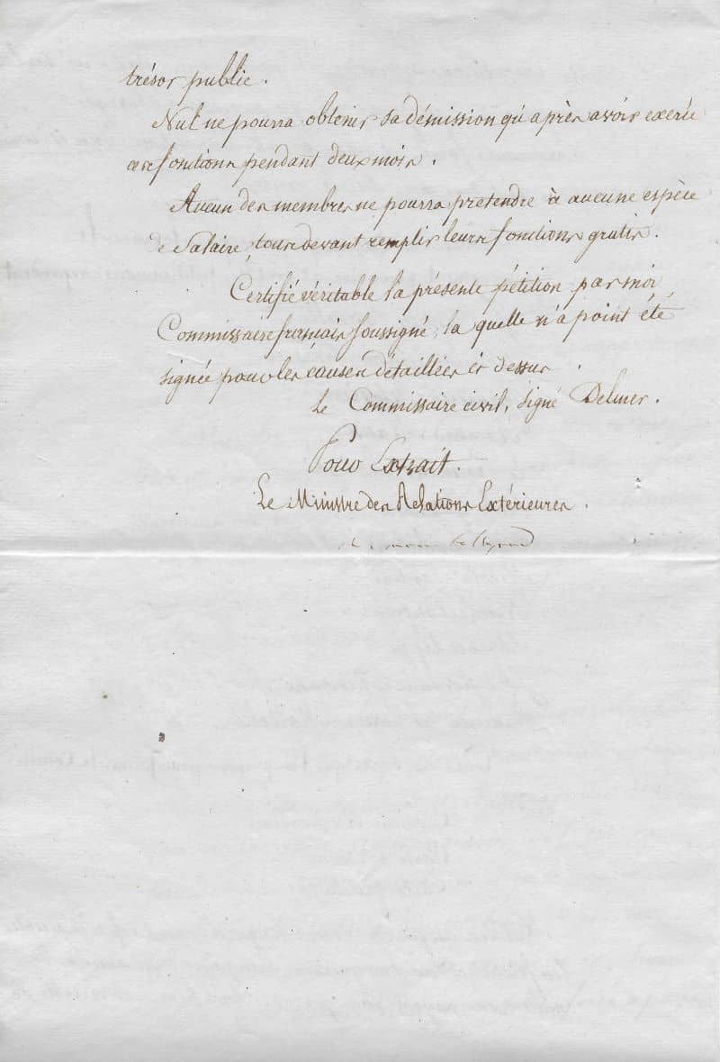 La pétition est signée pour copie conforme par le commissaire civil Delmer et le ministre des relations extérieures Talleyrand.